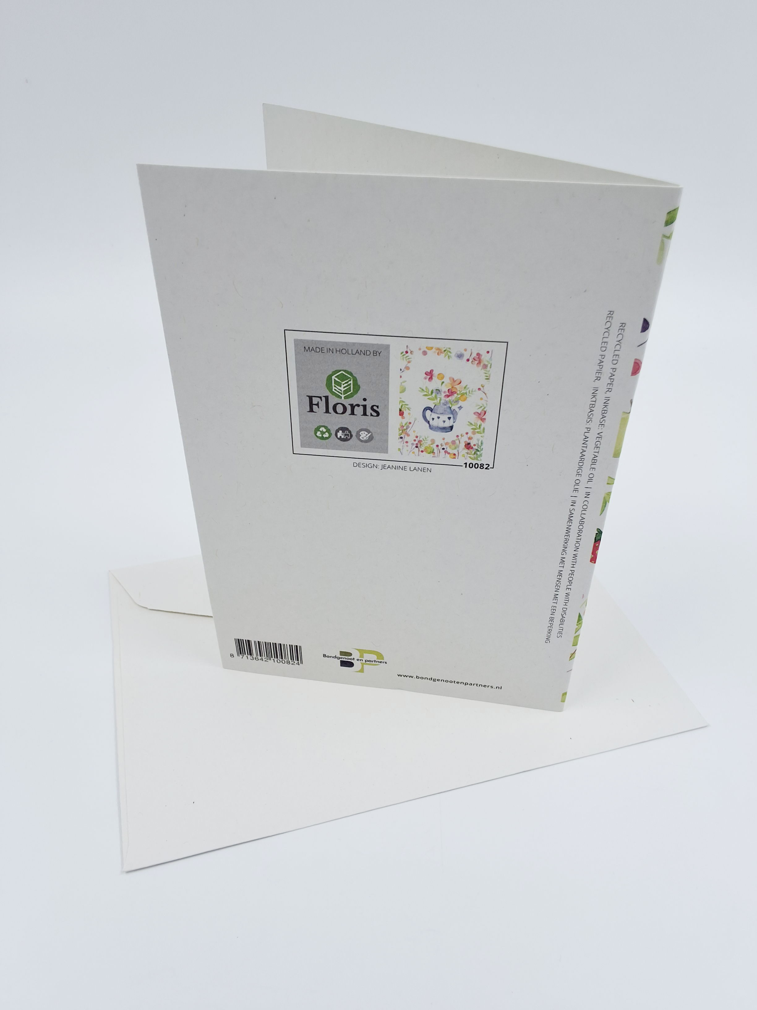 Onze wenskaarten zijn gemaakt van gerecycled papier en bedrukt met inkt op basis van plantaardige olie.