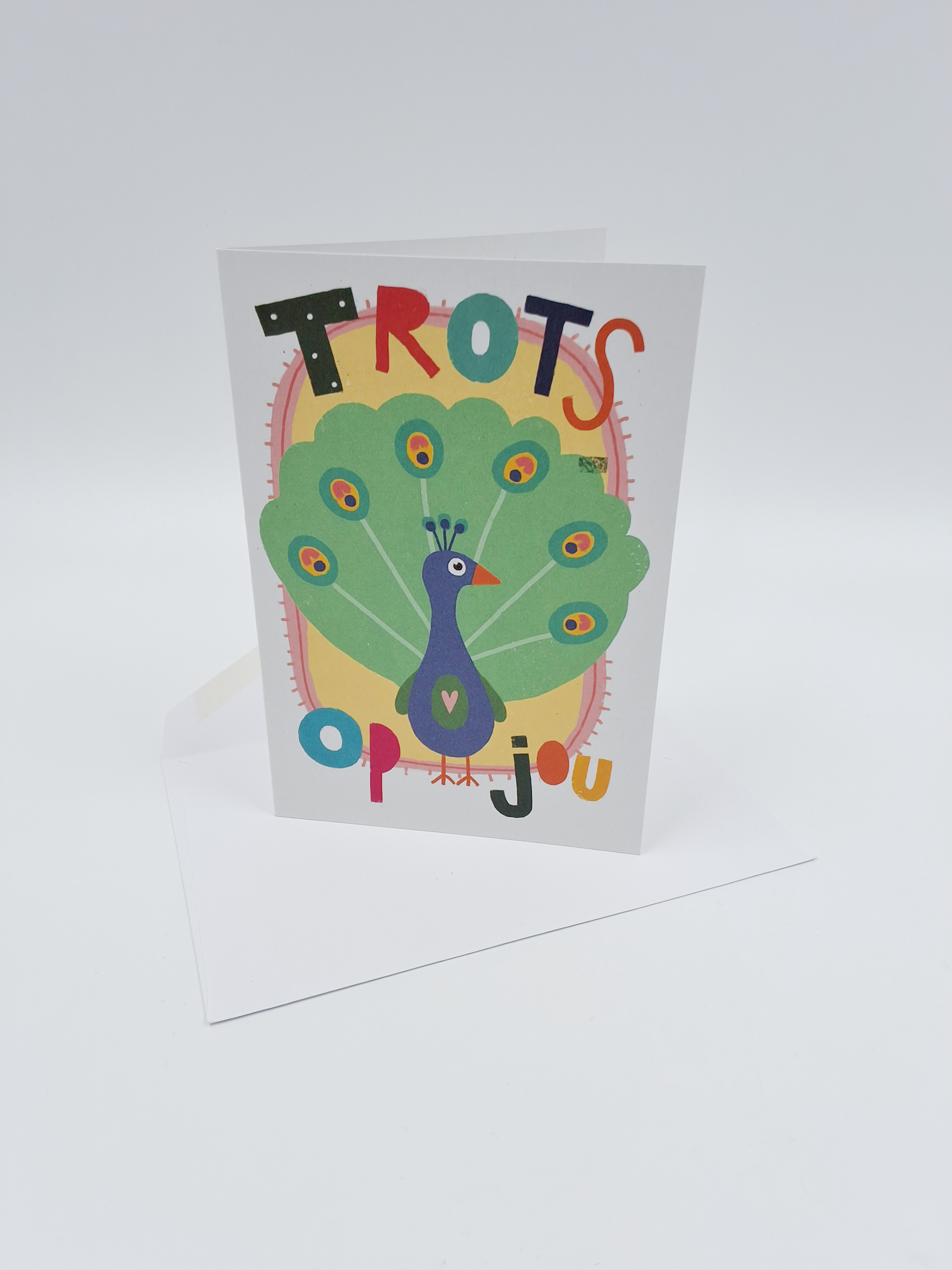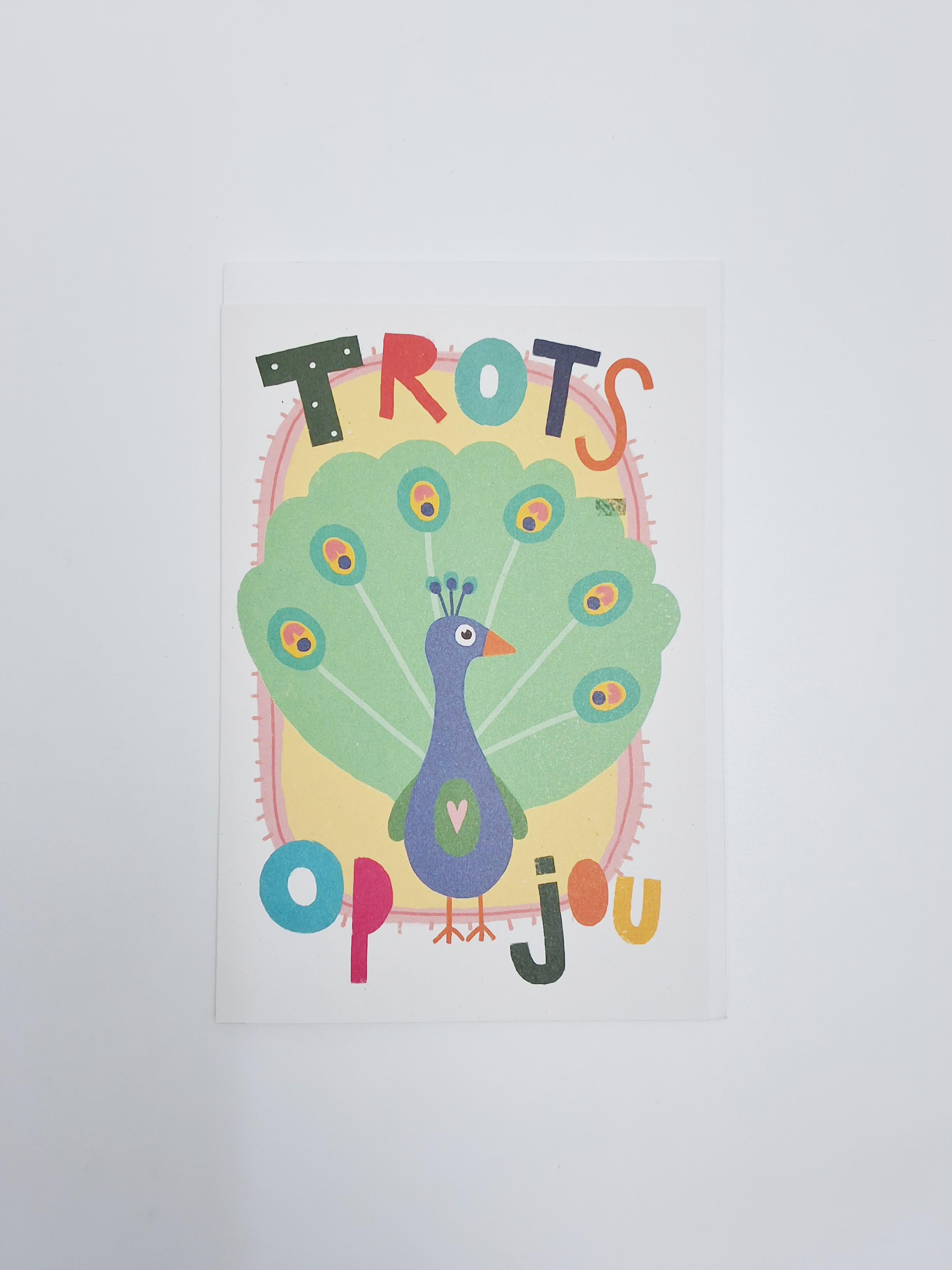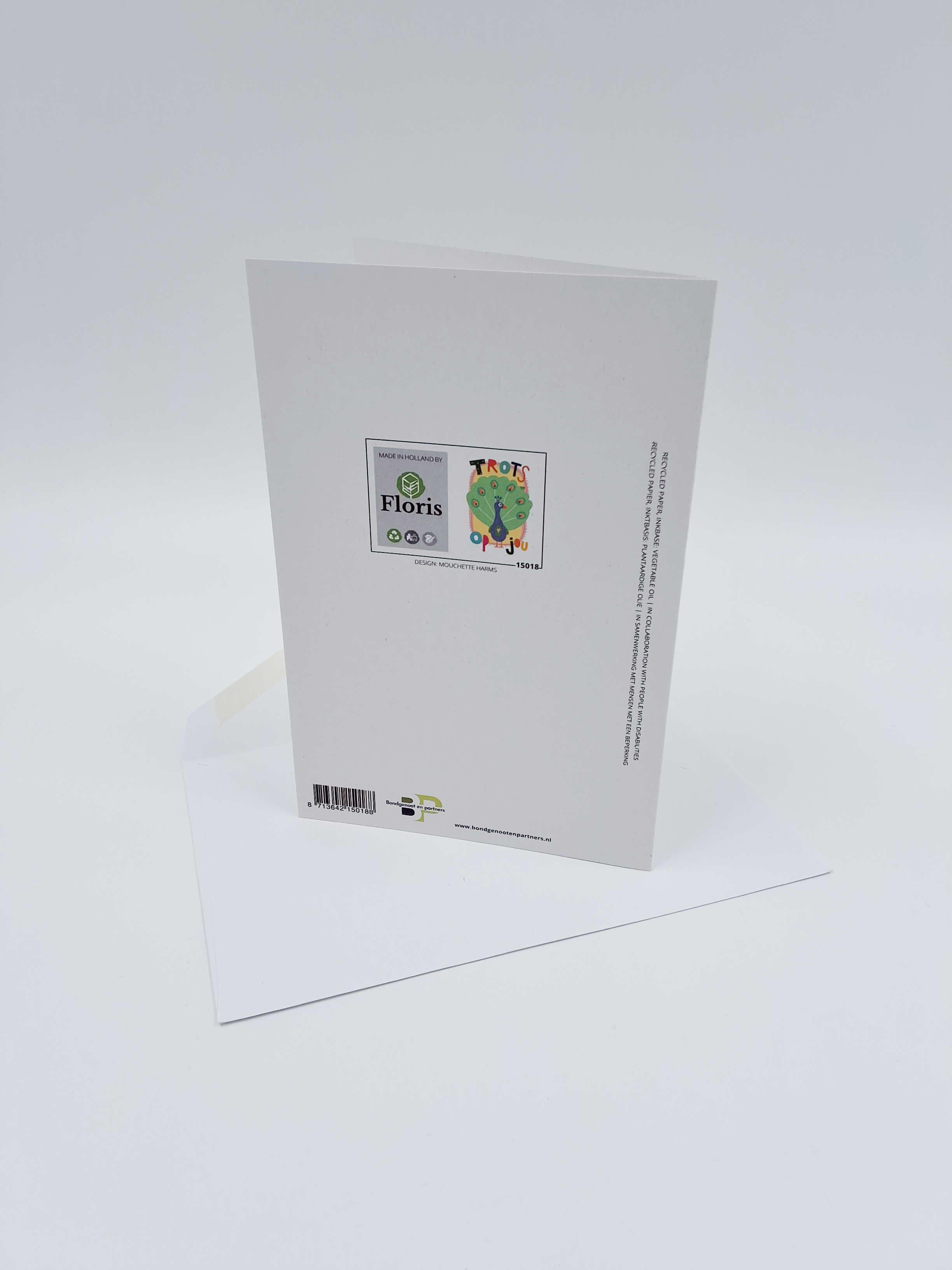 Deze wenskaart is iets groter dan een standaard wenskaart en heeft geen plastiek verpakking. Elke kaart komt met een passende envelop.