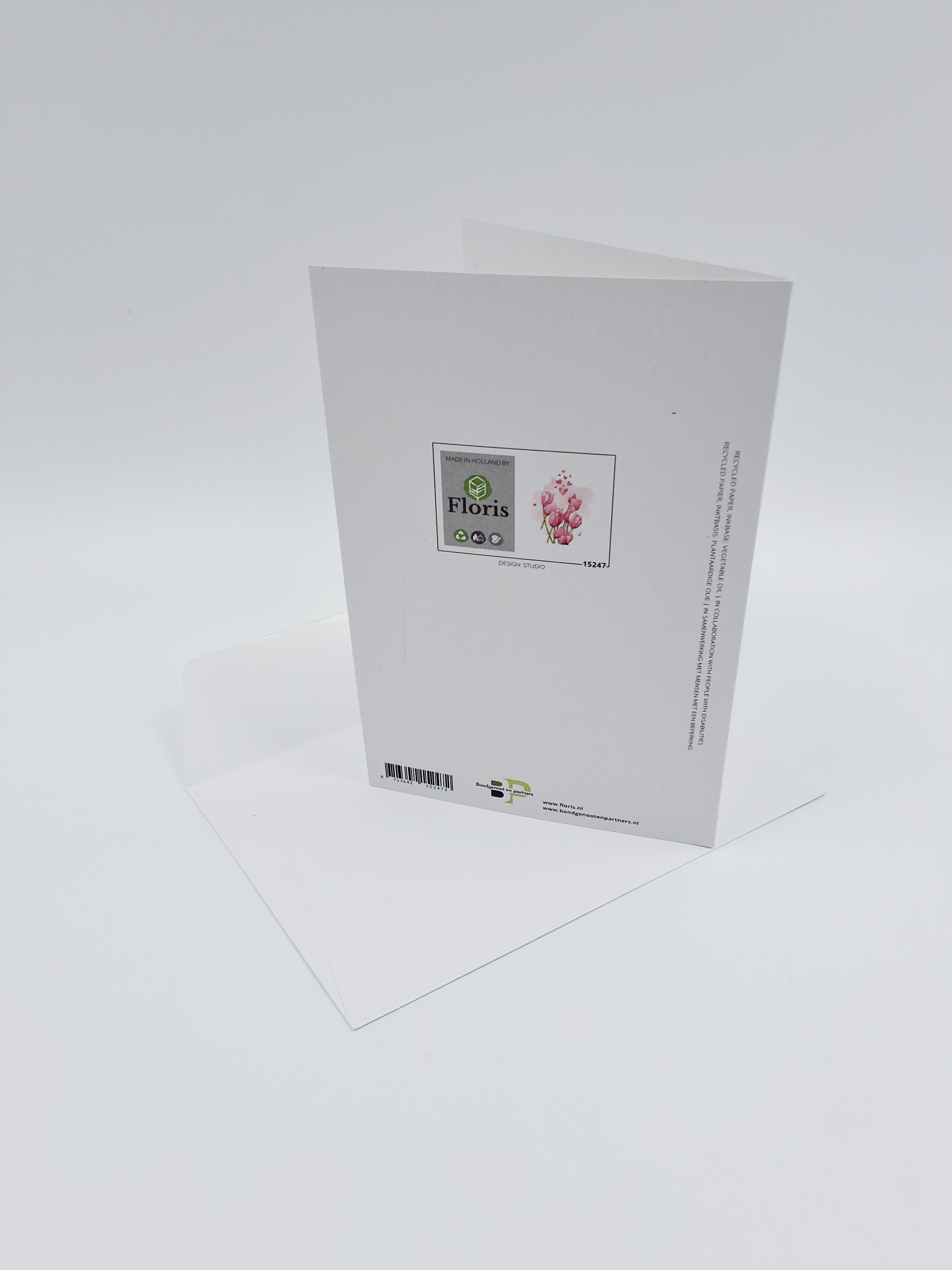 Deze wenskaart is iets groter dan een standaard wenskaart en heeft geen plastiek verpakking. Elke kaart komt met een passende envelop.