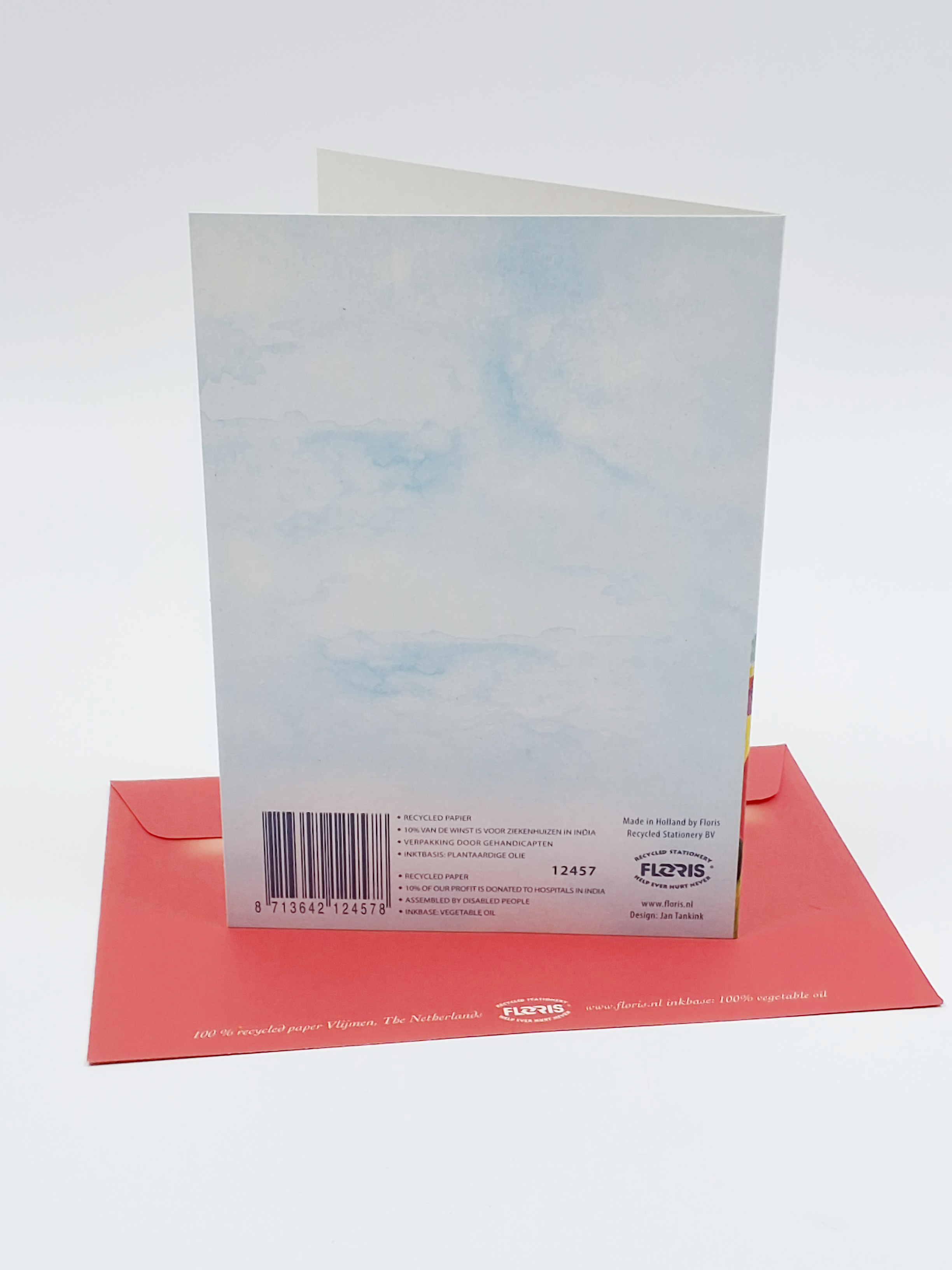 Onze wenskaarten zijn gemaakt van gerecycled papier en bedrukt met inkt op basis van plantaardige olie.