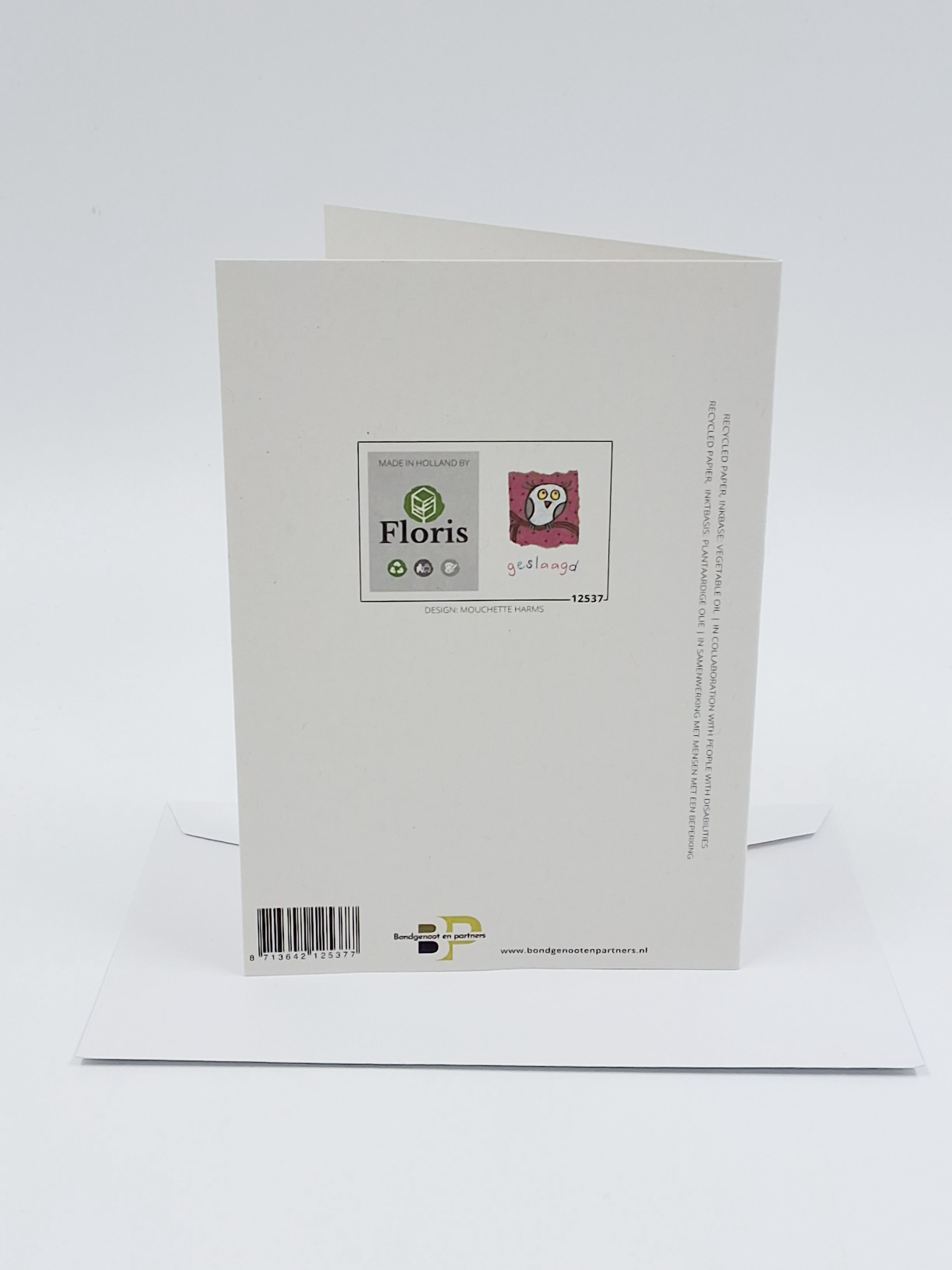 Onze wenskaarten zijn gemaakt van gerecycled papier en bedrukt met inkt op basis van plantaardige olie.