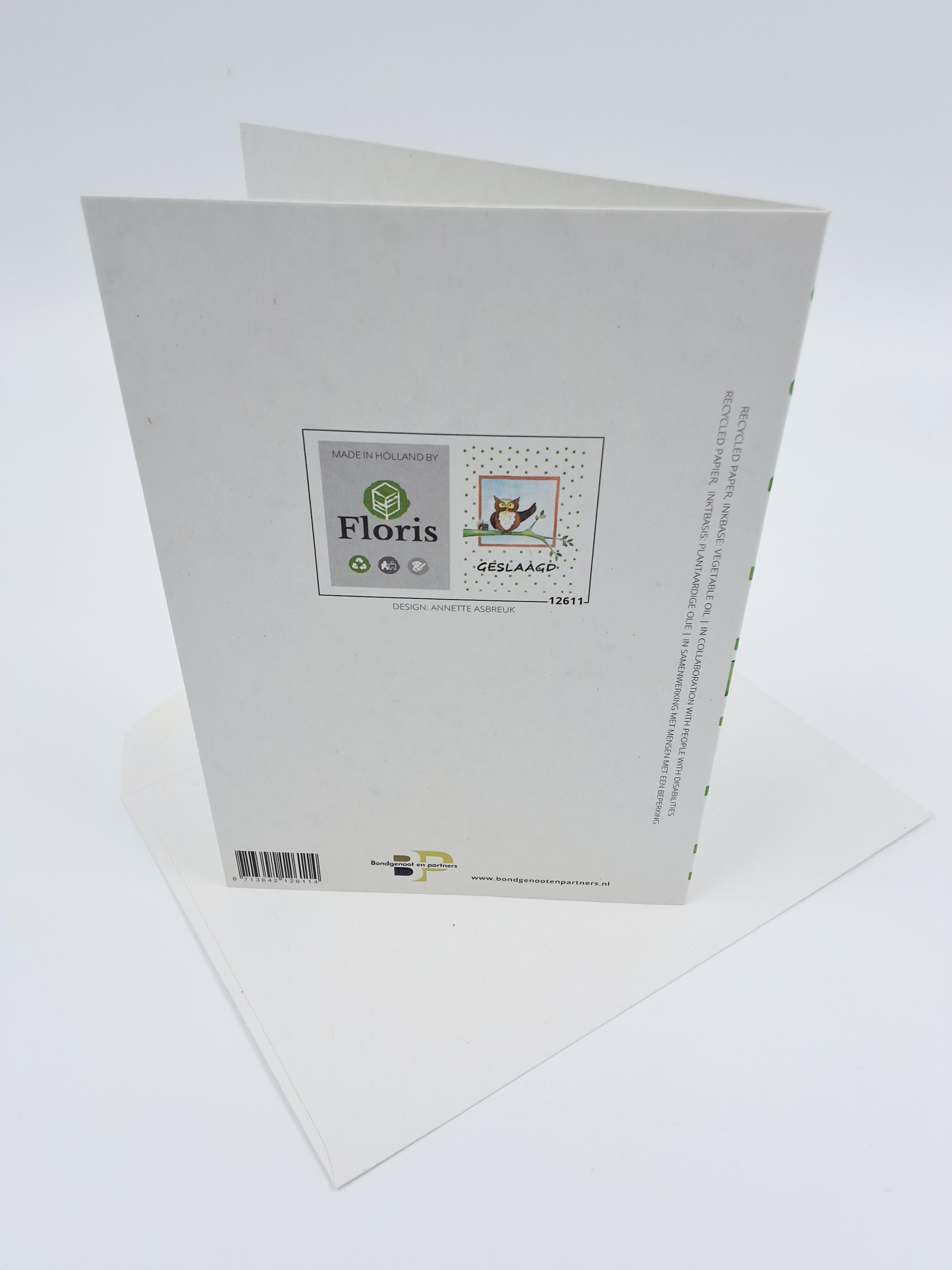 Onze wenskaarten zijn gemaakt van gerecycled papier en bedrukt met inkt op basis van plantaardige olie.