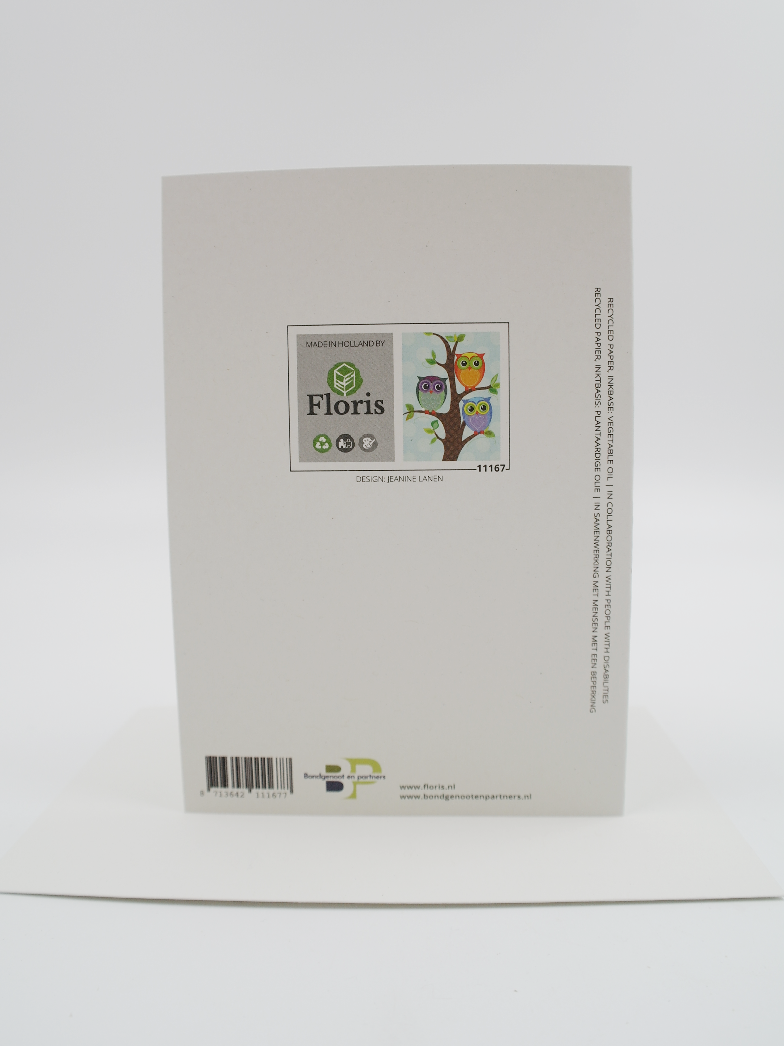 Onze wenskaarten zijn gemaakt van gerecycled papier en bedrukt met inkt op basis van plantaardige olie.