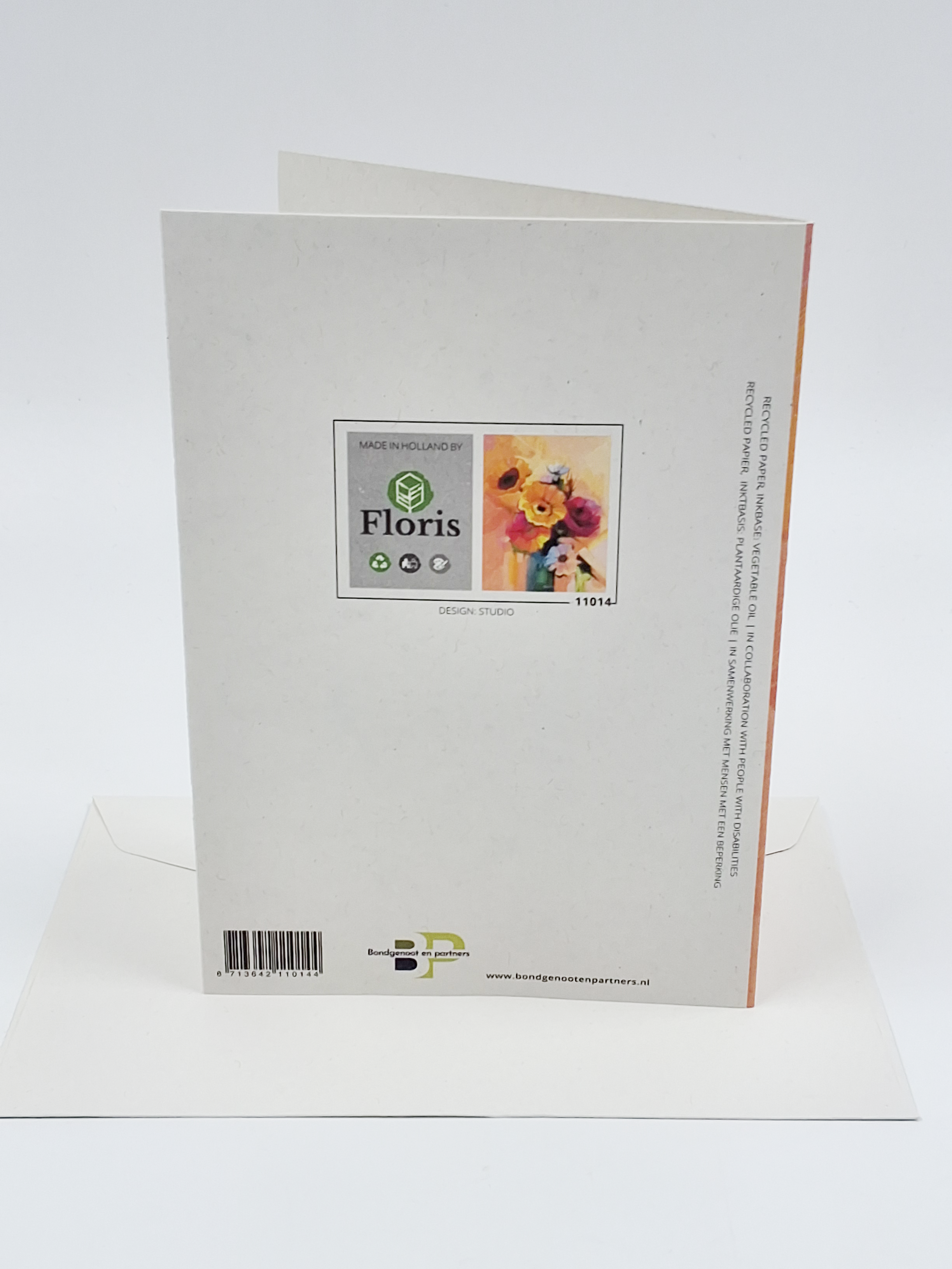 Onze wenskaarten zijn gemaakt van gerecycled papier en bedrukt met inkt op basis van plantaardige olie.