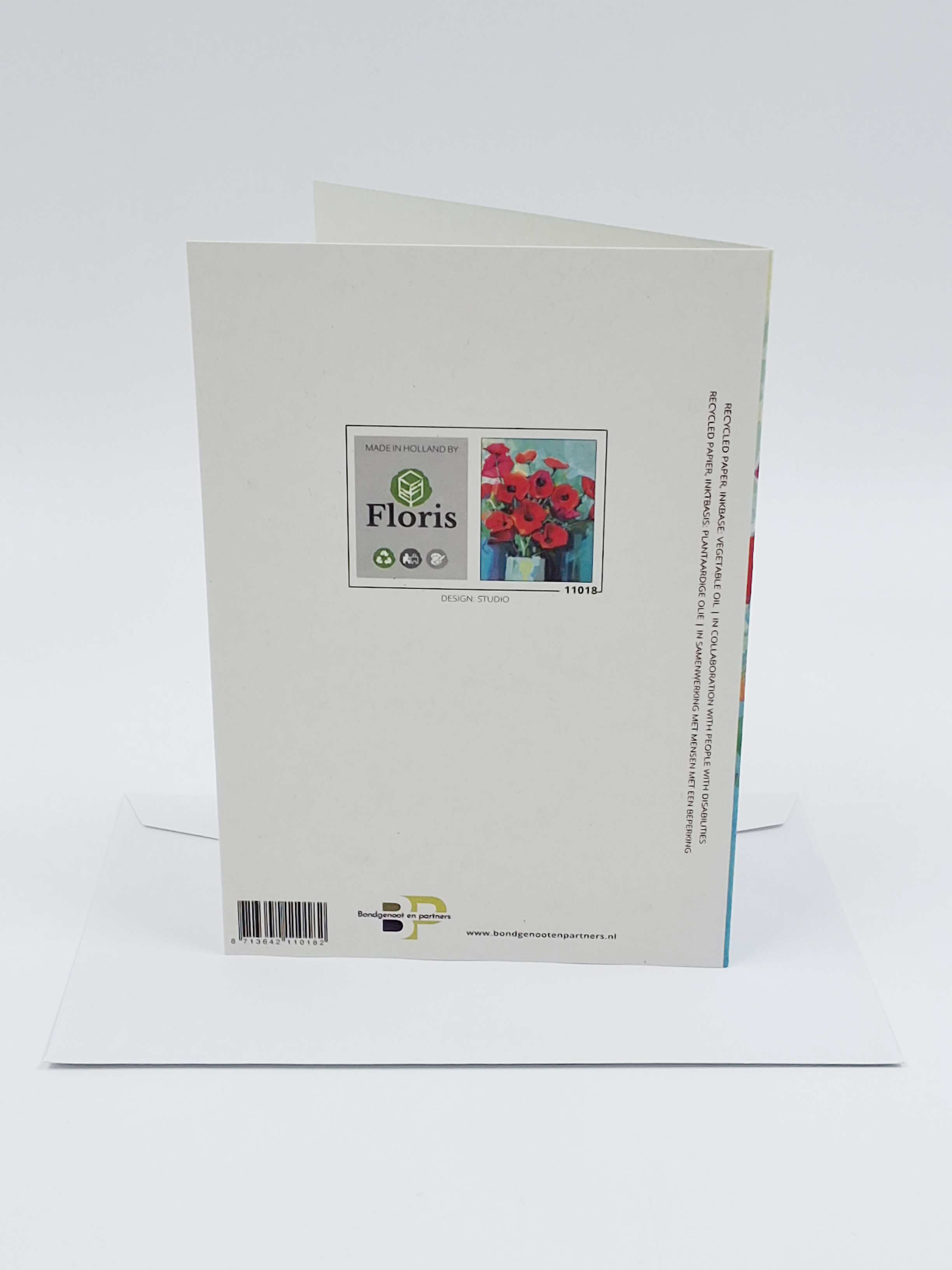 Onze wenskaarten zijn gemaakt van gerecycled papier en bedrukt met inkt op basis van plantaardige olie.