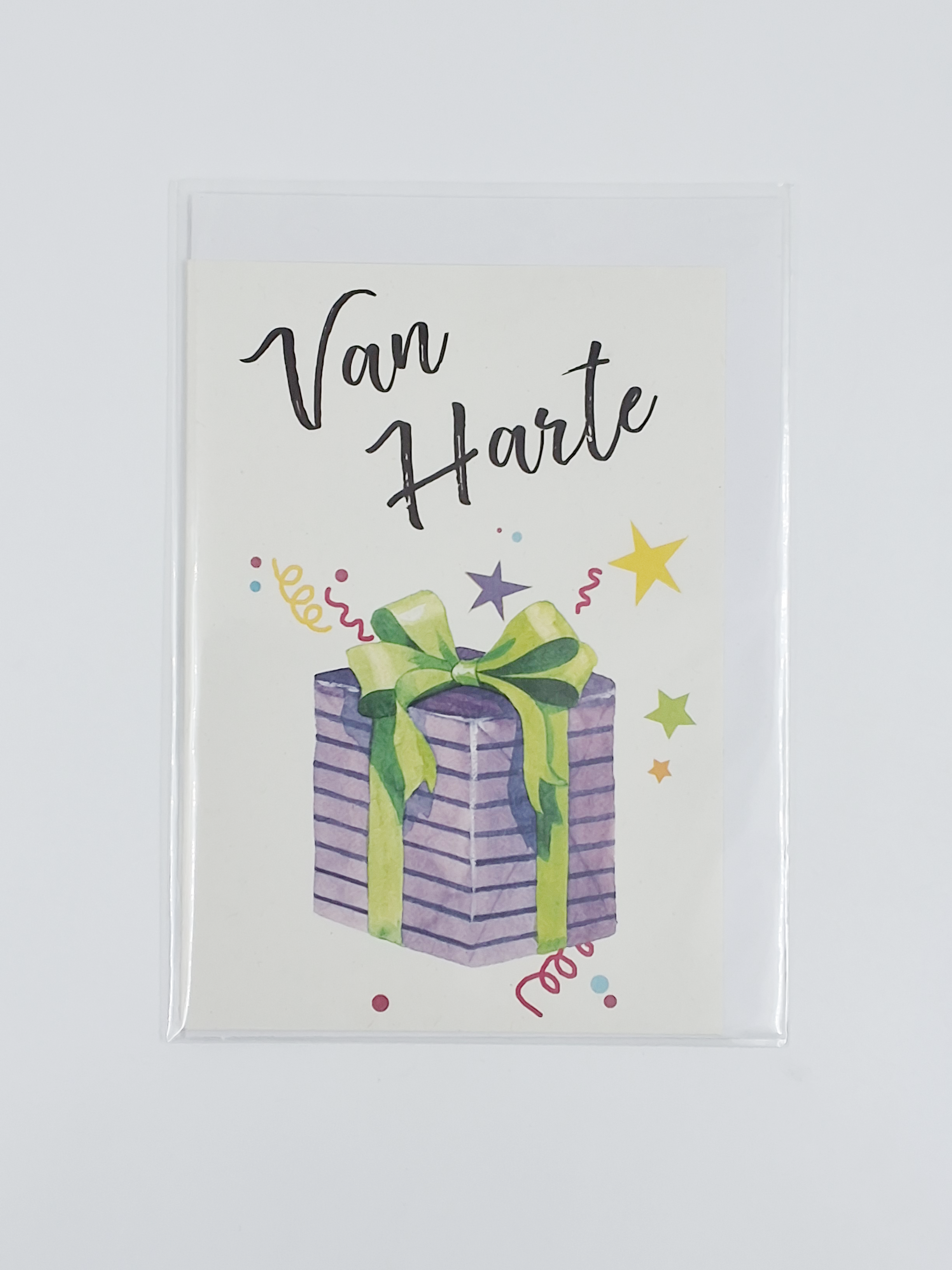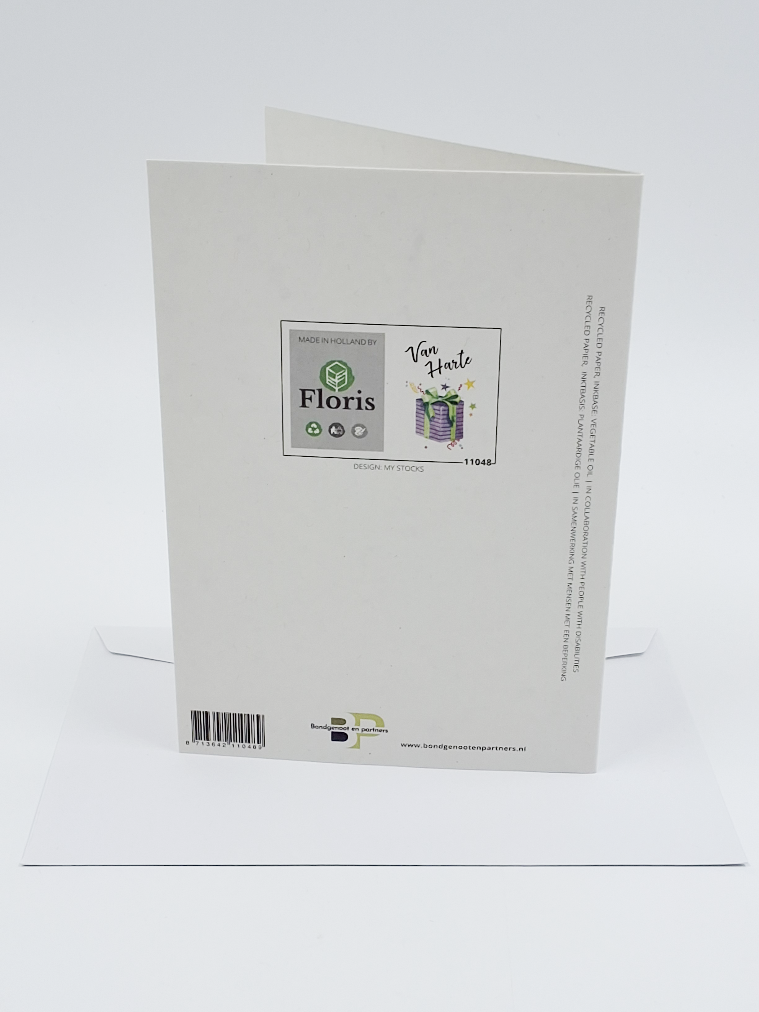 Onze wenskaarten zijn gemaakt van gerecycled papier en bedrukt met inkt op basis van plantaardige olie.