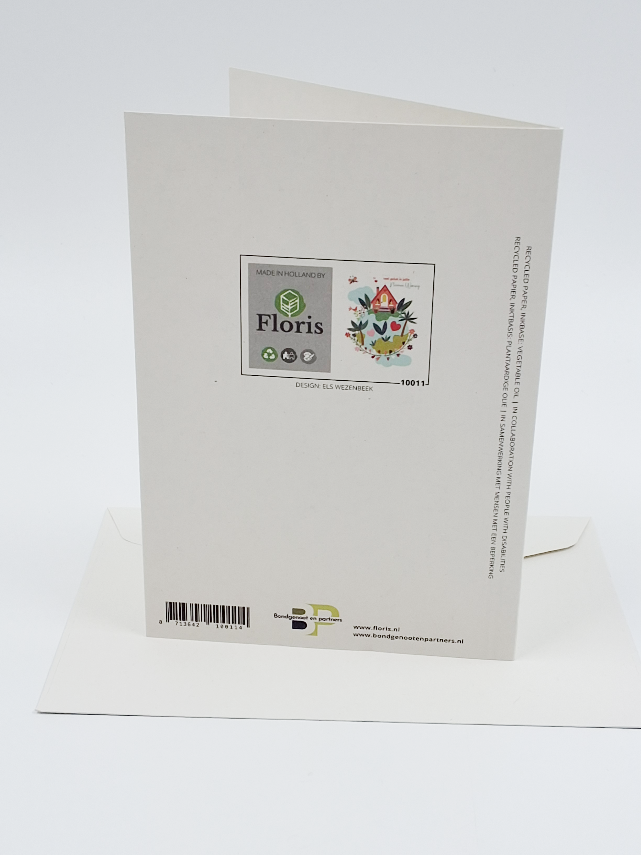 Onze wenskaarten zijn gemaakt van gerecycled papier en bedrukt met inkt op basis van plantaardige olie.