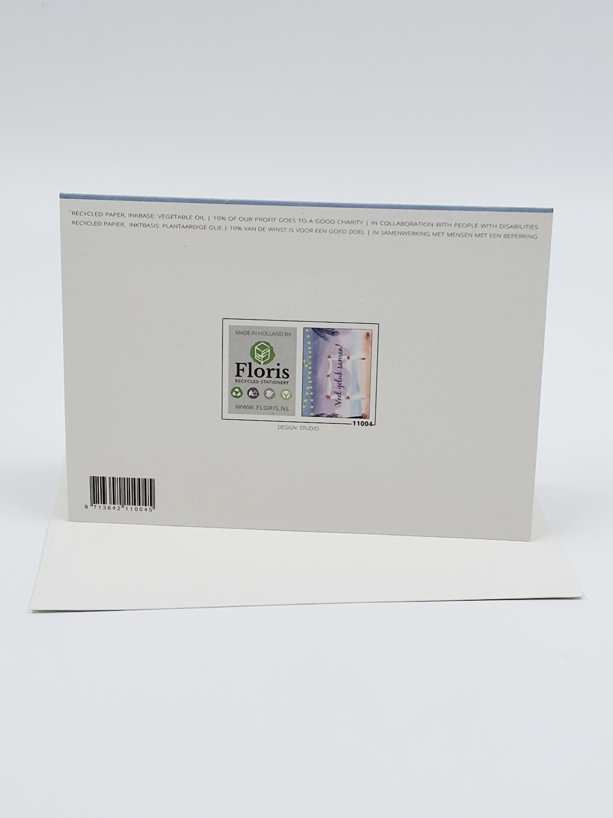 Onze wenskaarten zijn gemaakt van gerecycled papier en bedrukt met inkt op basis van plantaardige olie.