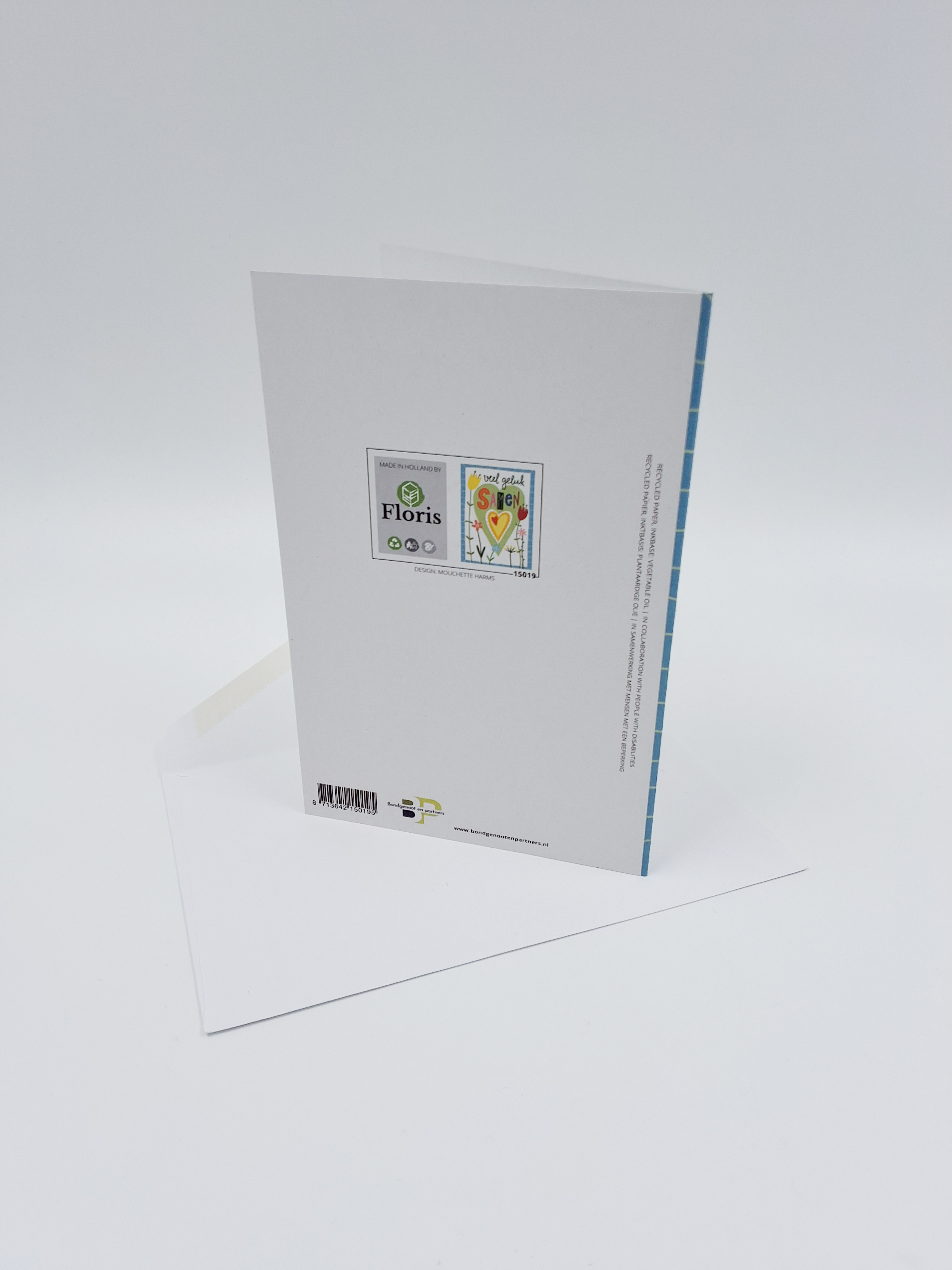 Deze wenskaart is iets groter dan een standaard wenskaart en heeft geen plastiek verpakking. Elke kaart komt met een passende envelop.