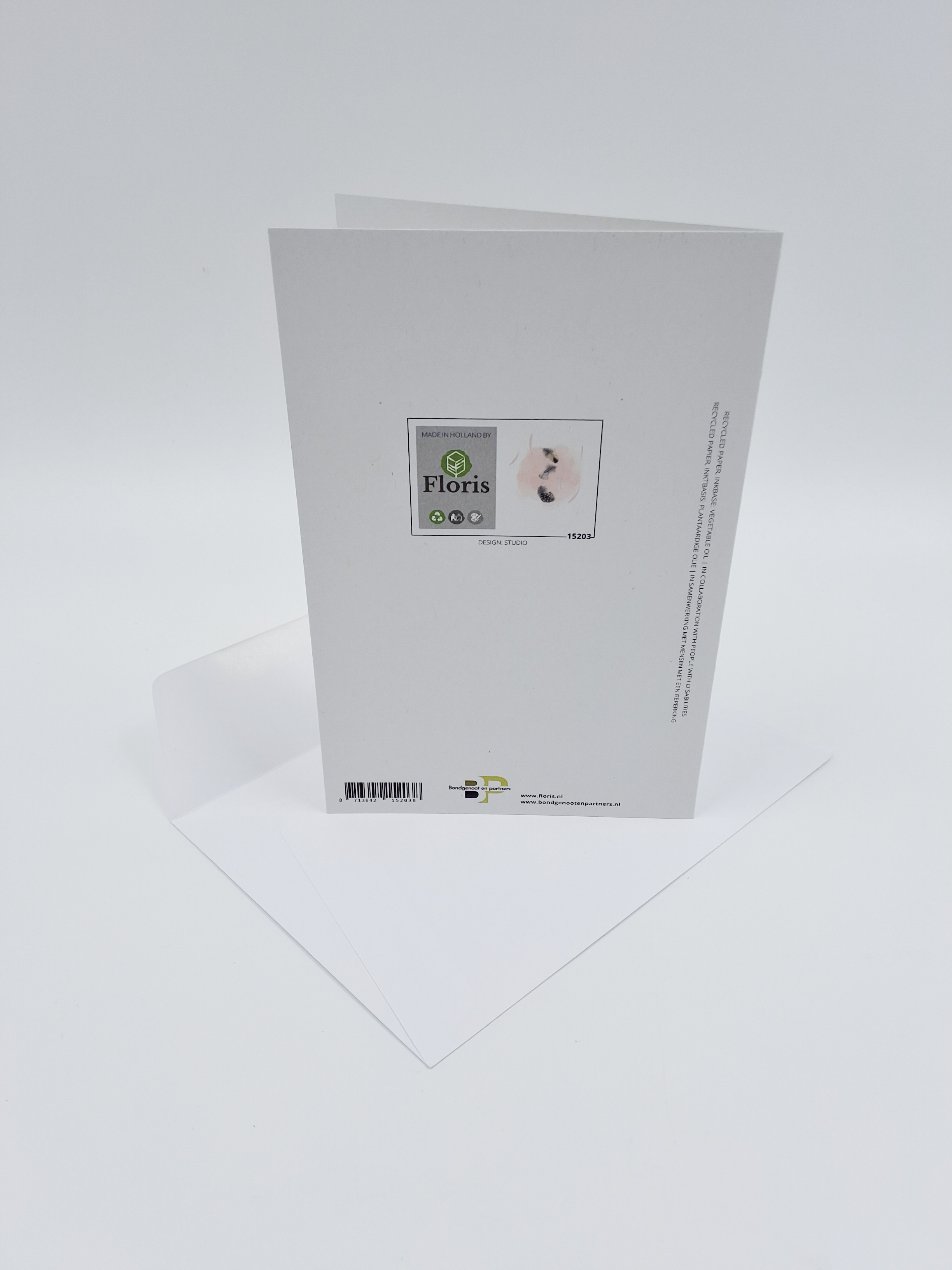 Deze wenskaart is iets groter dan een standaard wenskaart en heeft geen plastiek verpakking. Elke kaart komt met een passende envelop.