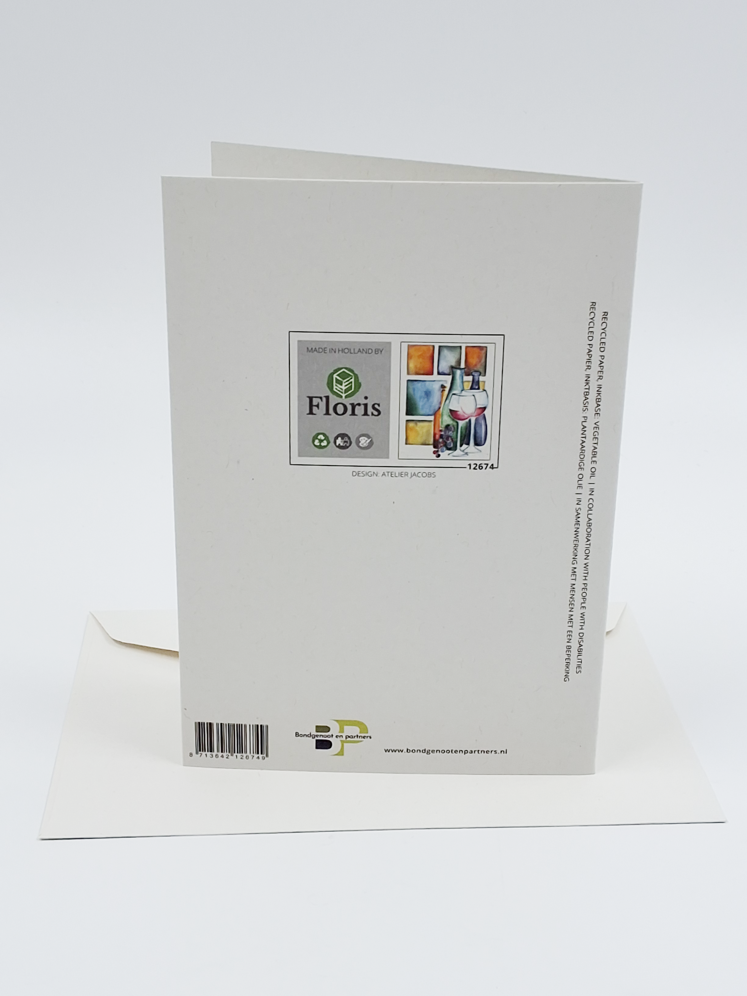 Onze wenskaarten zijn gemaakt van gerecycled papier en bedrukt met inkt op basis van plantaardige olie.