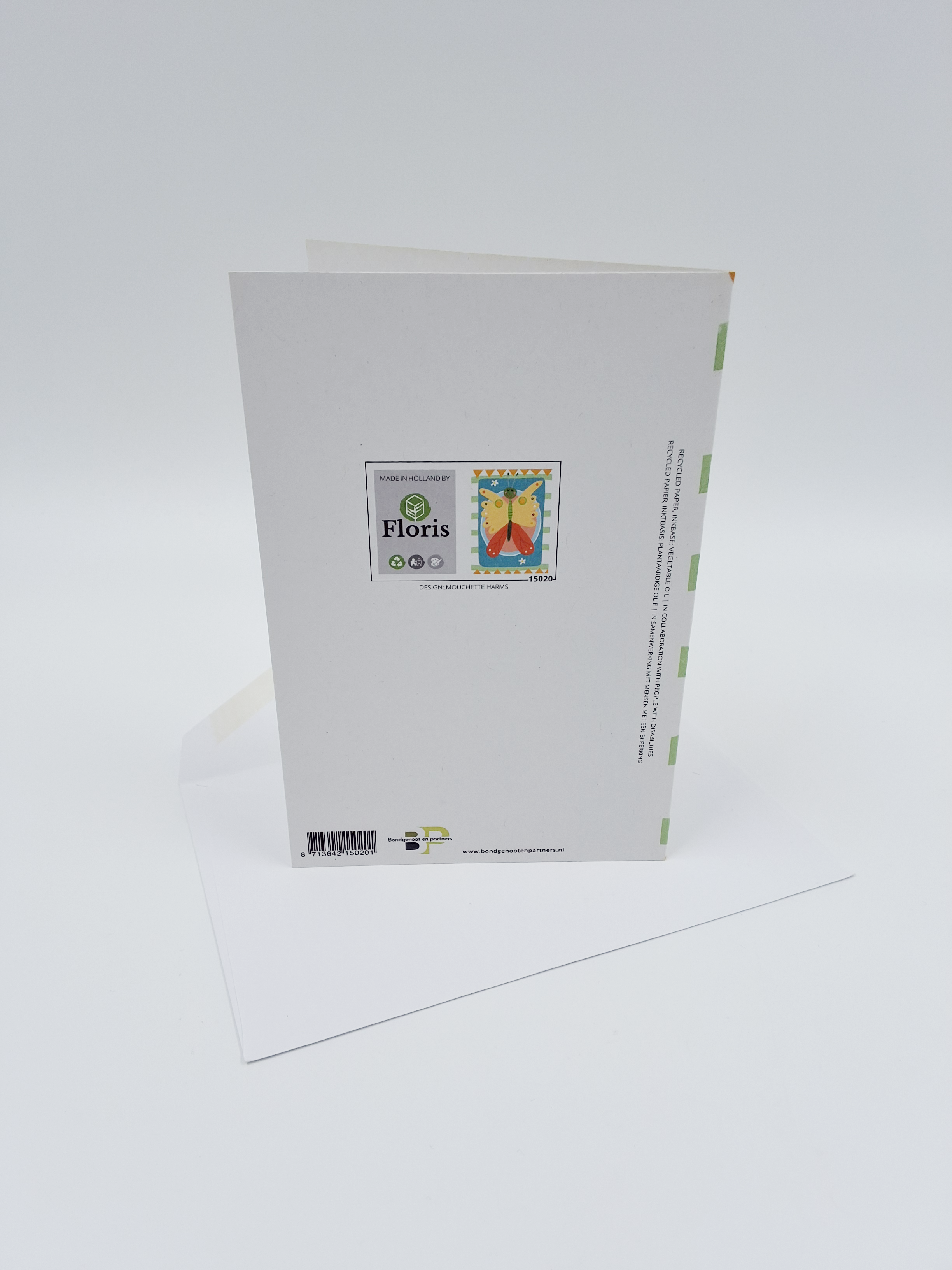 Onze wenskaarten zijn gemaakt van gerecycled papier en bedrukt met inkt op basis van plantaardige olie.