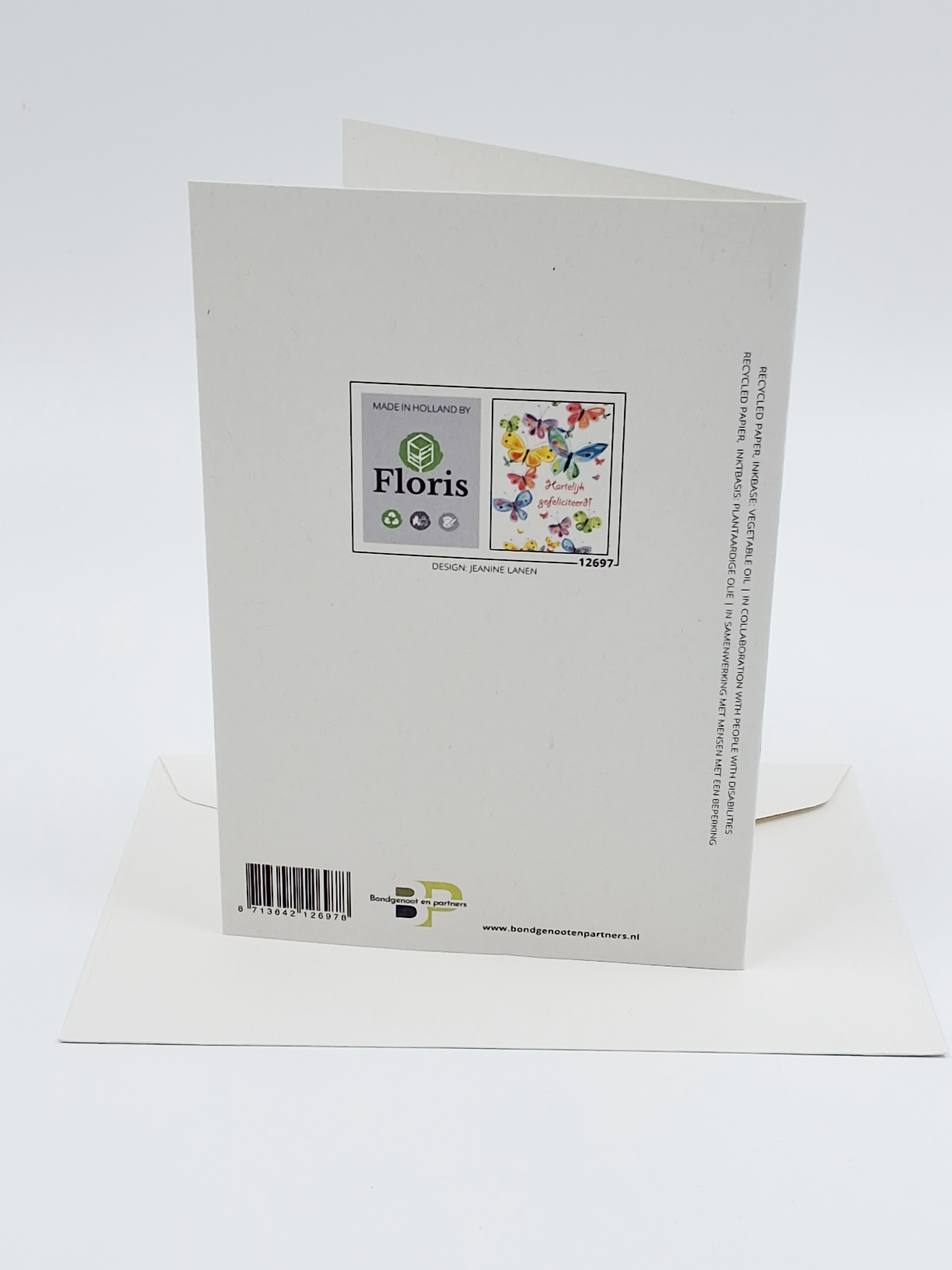 Onze wenskaarten zijn gemaakt van gerecycled papier en bedrukt met inkt op basis van plantaardige olie.