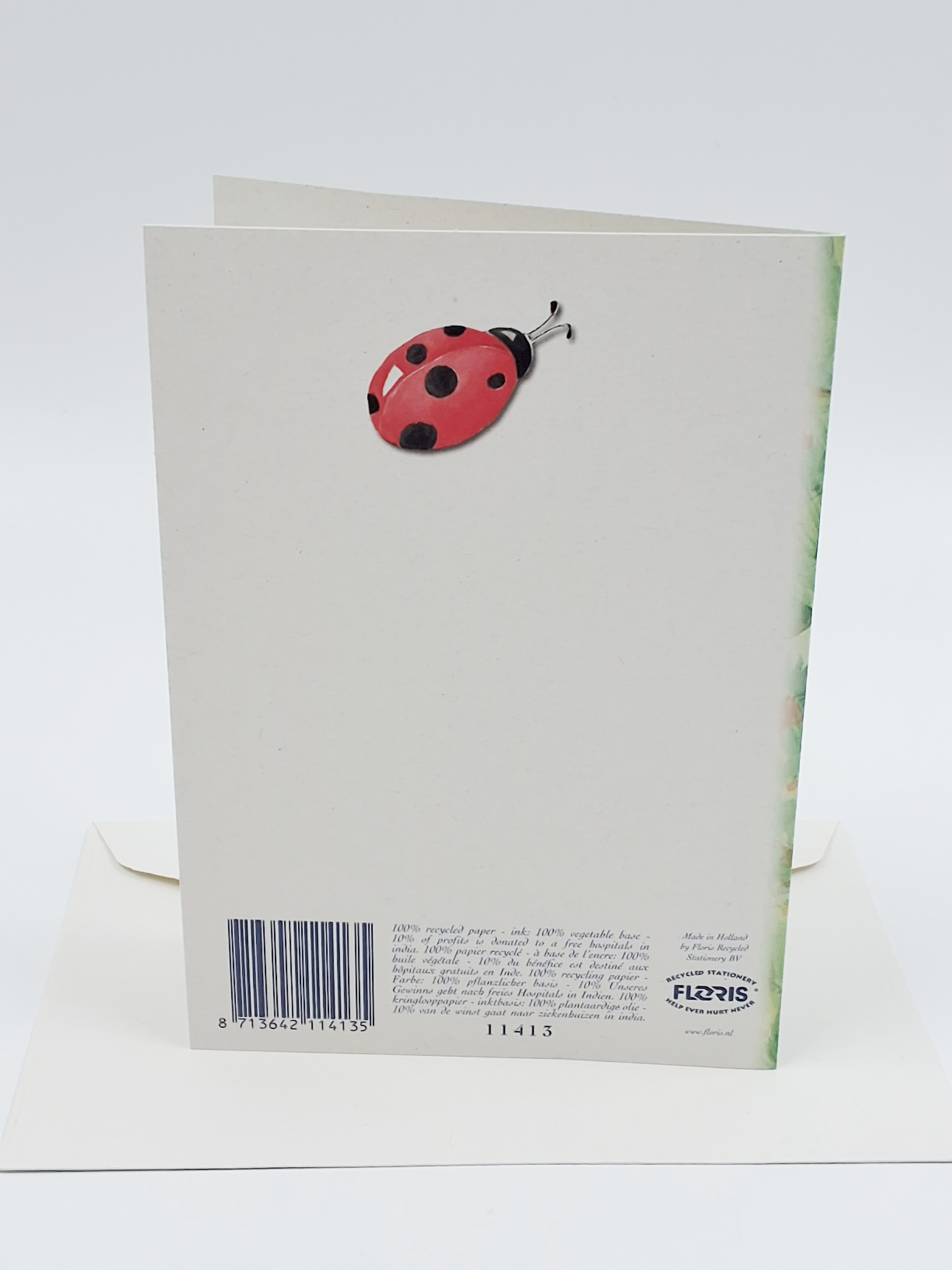 Onze wenskaarten zijn gemaakt van gerecycled papier en bedrukt met inkt op basis van plantaardige olie.