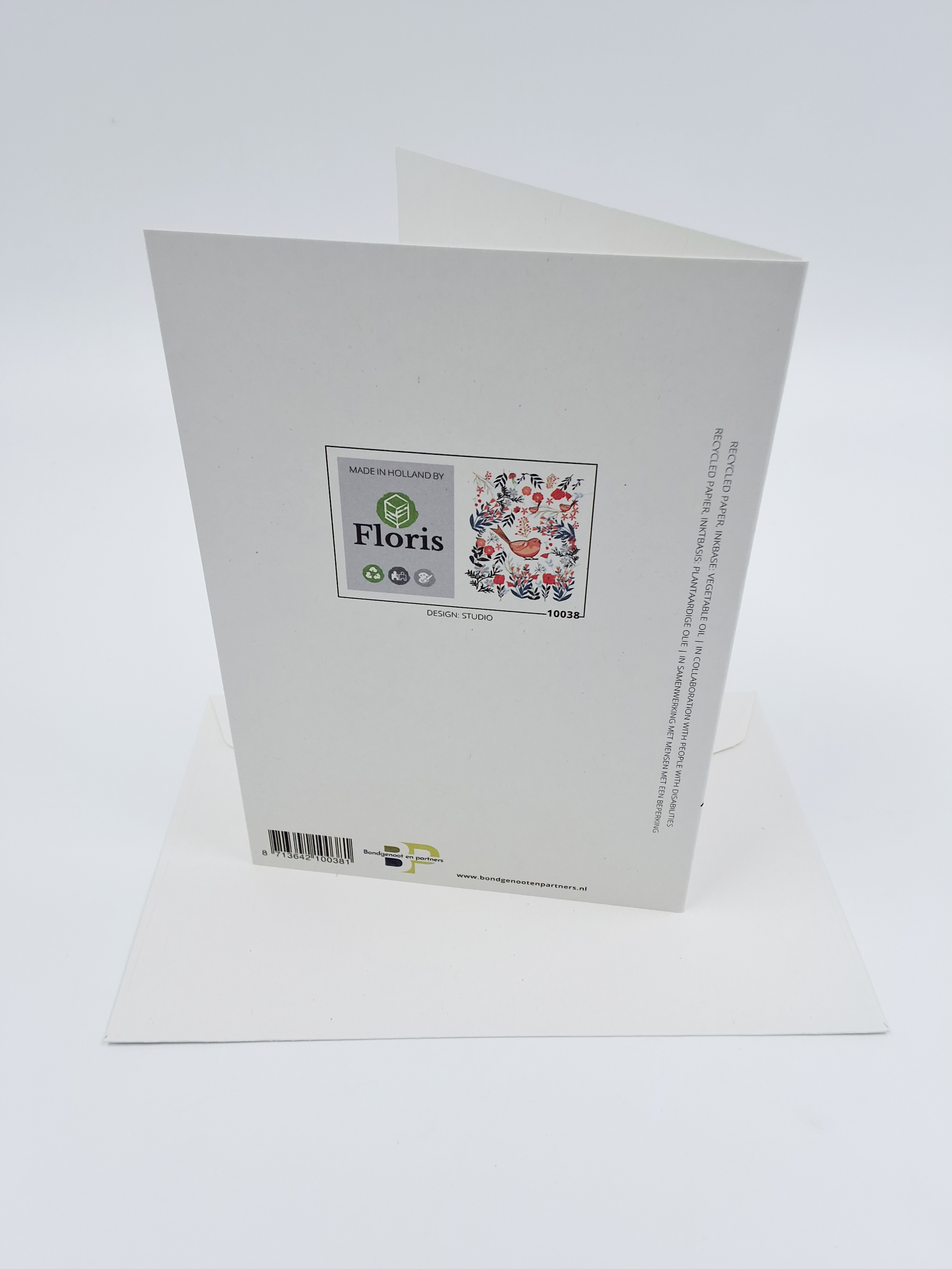 Onze wenskaarten zijn gemaakt van gerecycled papier en bedrukt met inkt op basis van plantaardige olie.