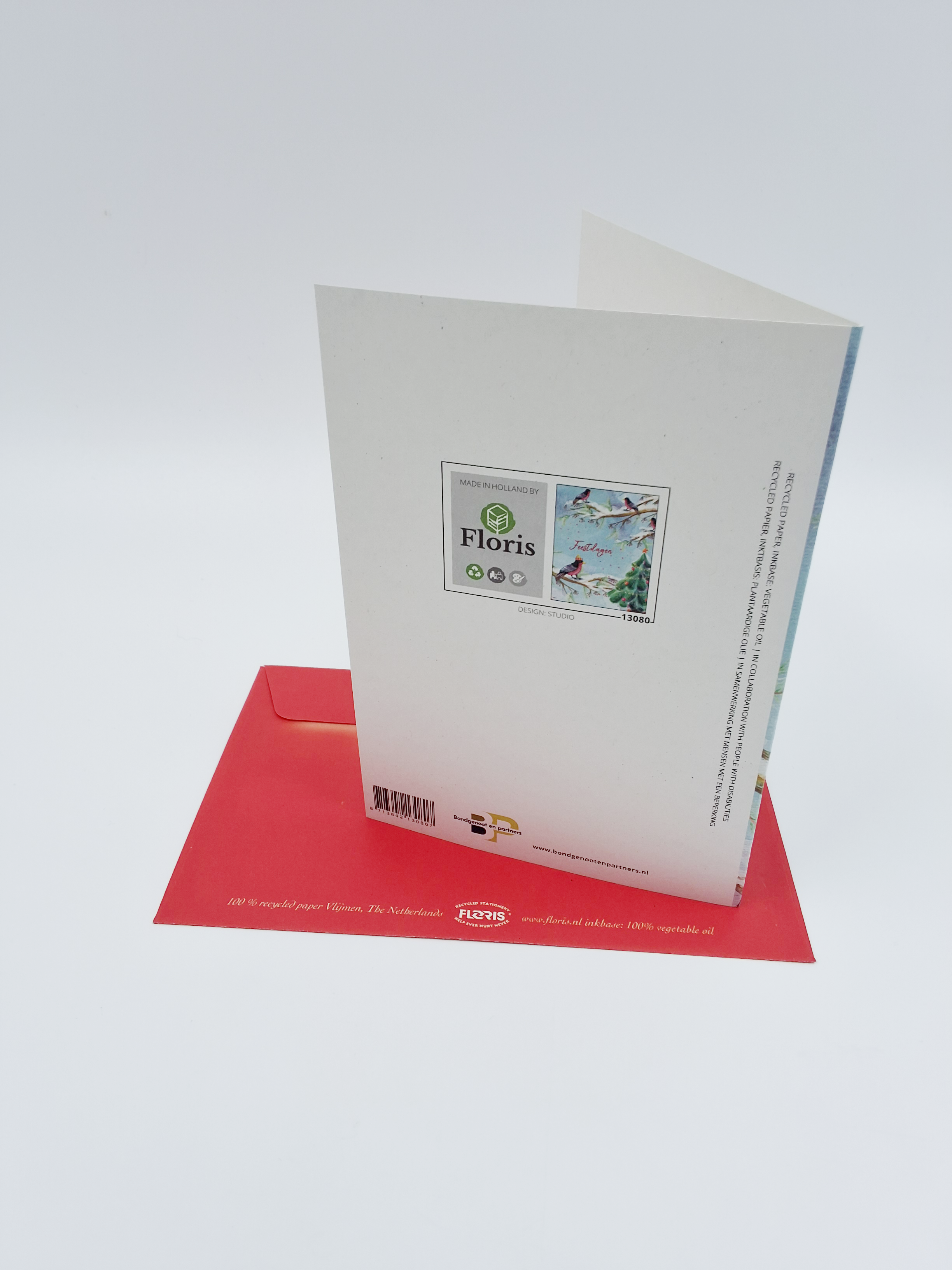 Onze kerstkaarten zijn gemaakt van gerecycled papier en bedrukt met inkt op basis van plantaardige olie.