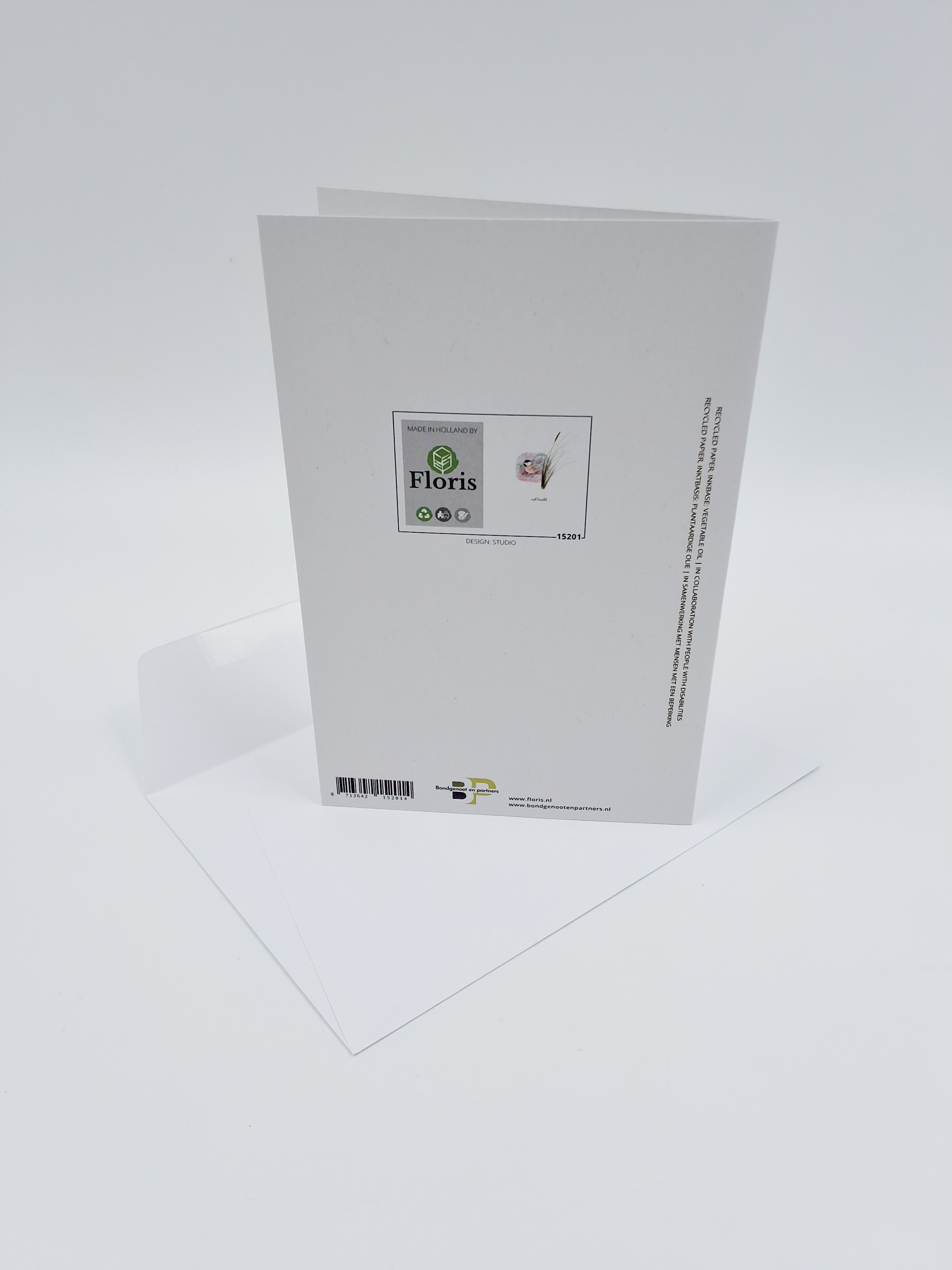 Deze wenskaart is iets groter dan een standaard wenskaart en heeft geen plastiek verpakking. Elke kaart komt met een passende envelop.