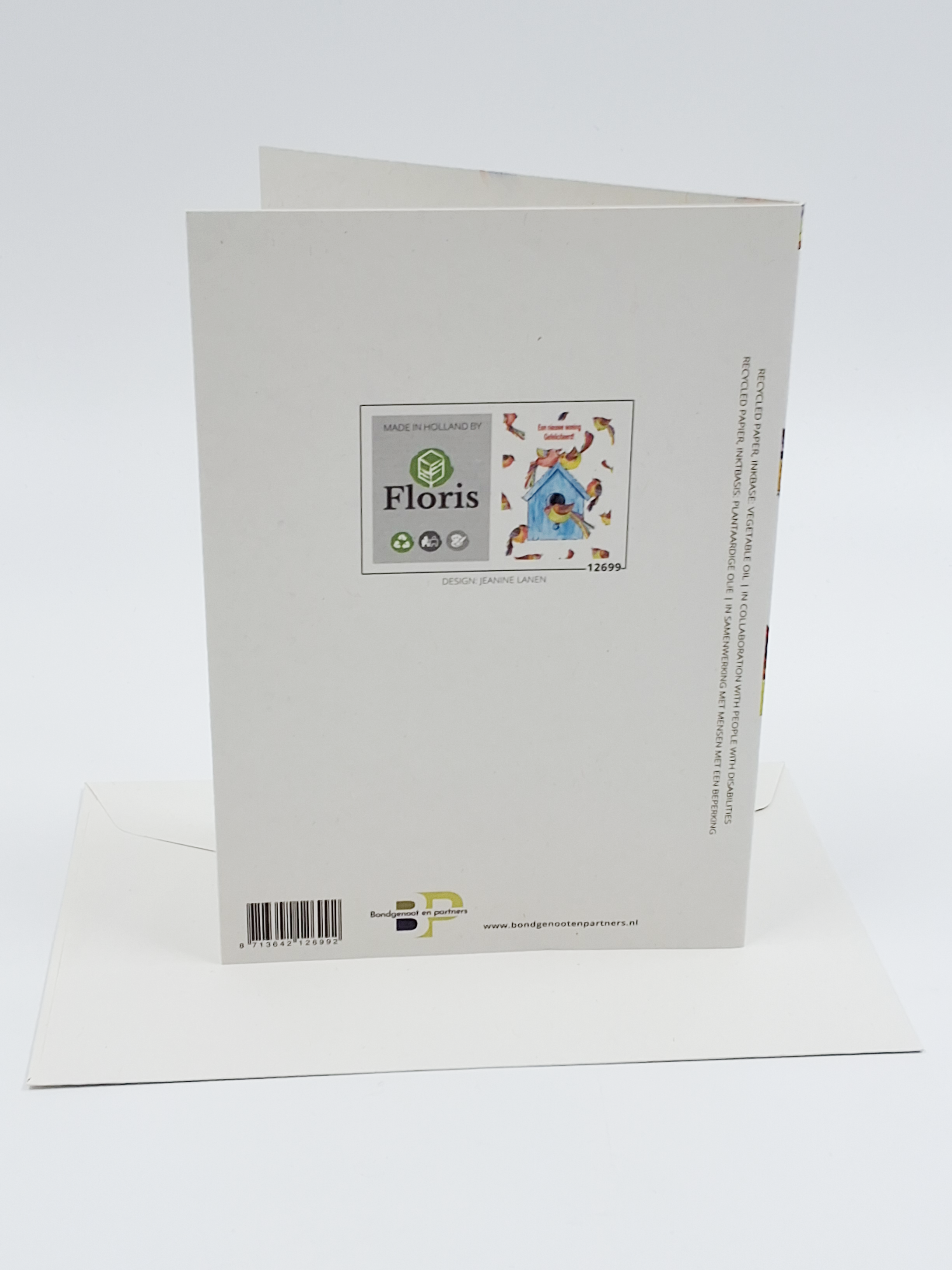 Onze wenskaarten zijn gemaakt van gerecycled papier en bedrukt met inkt op basis van plantaardige olie.