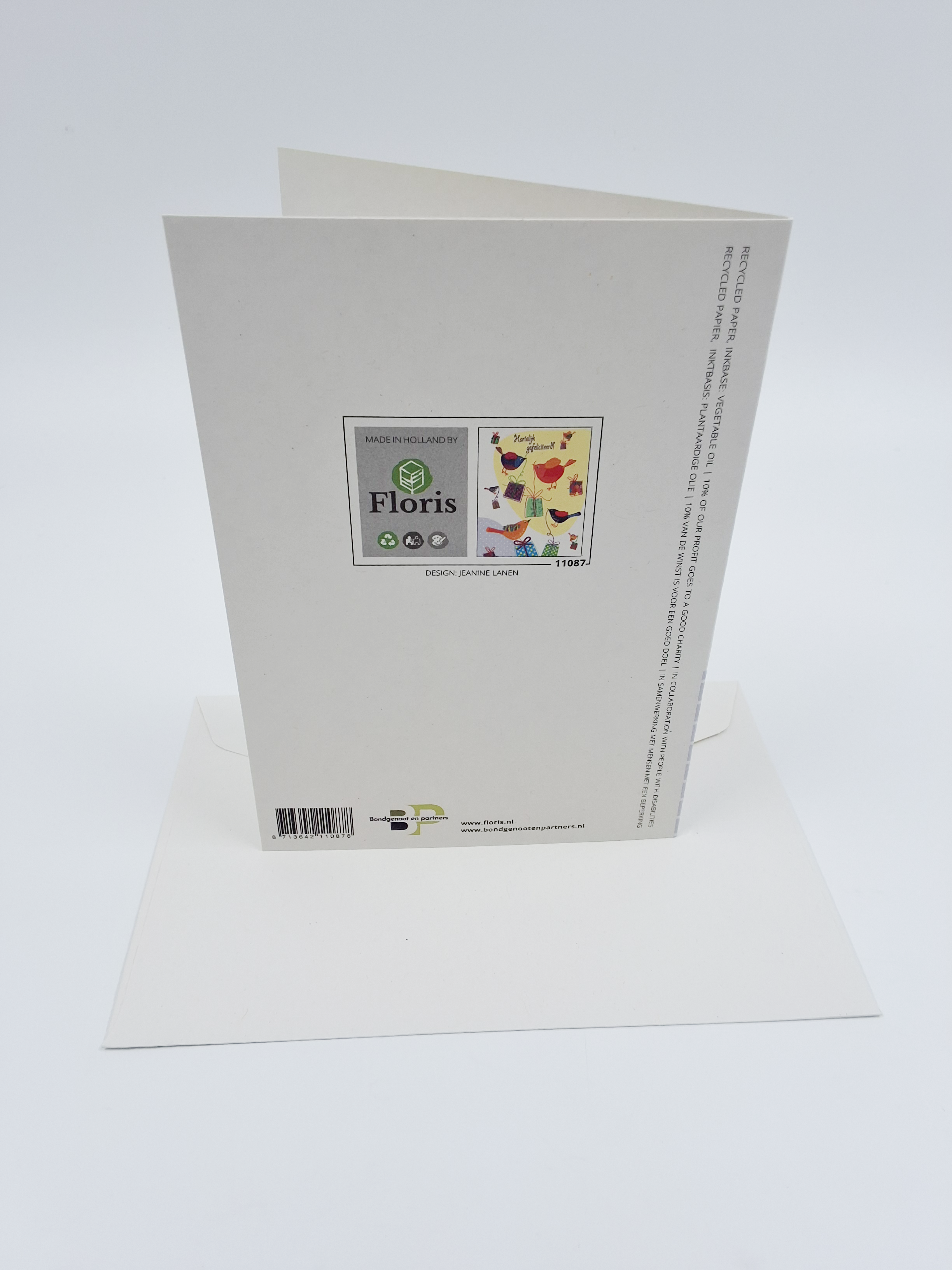 Onze wenskaarten zijn gemaakt van gerecycled papier en bedrukt met inkt op basis van plantaardige olie.