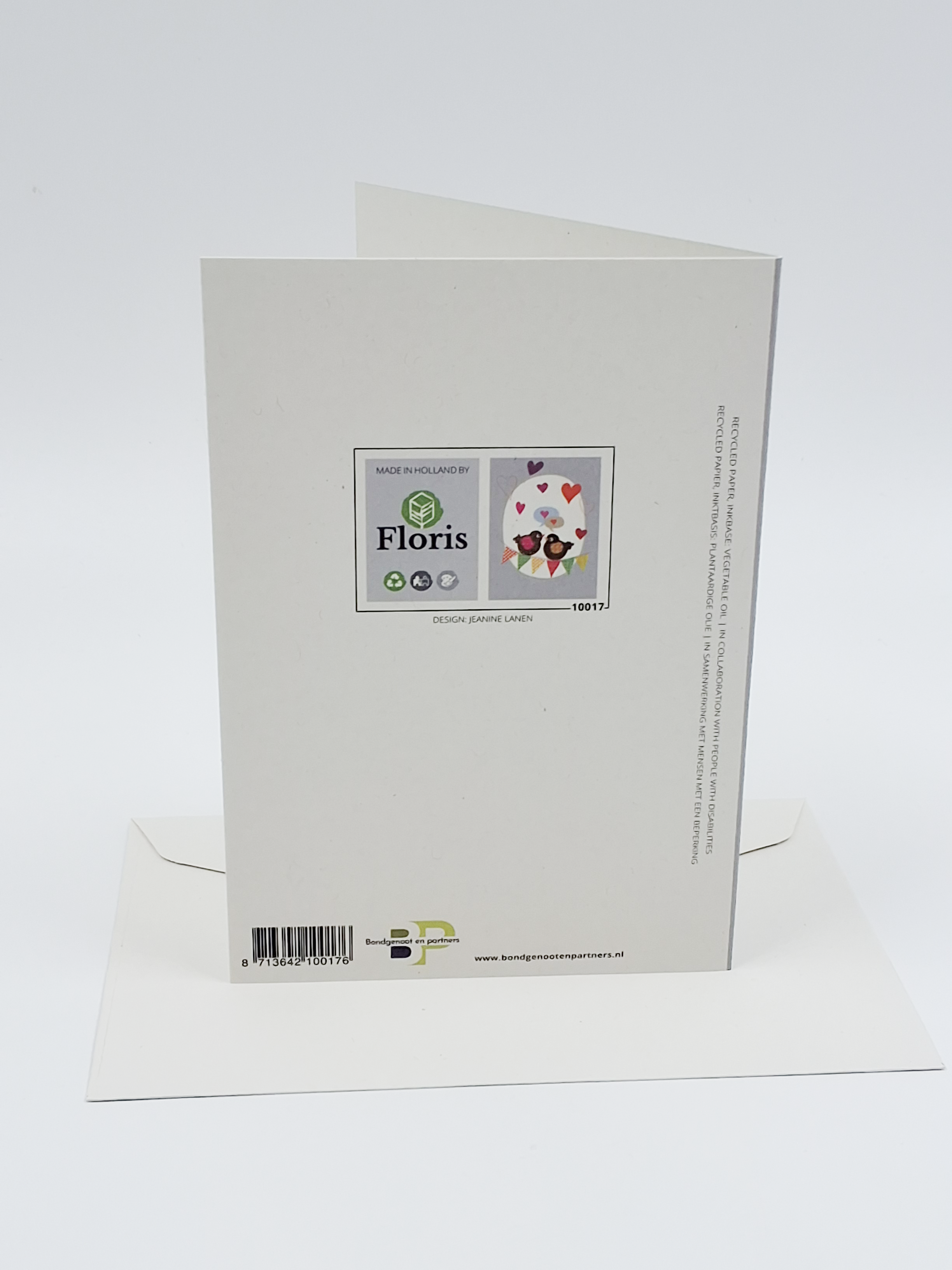 Onze wenskaarten zijn gemaakt van gerecycled papier en bedrukt met inkt op basis van plantaardige olie.
