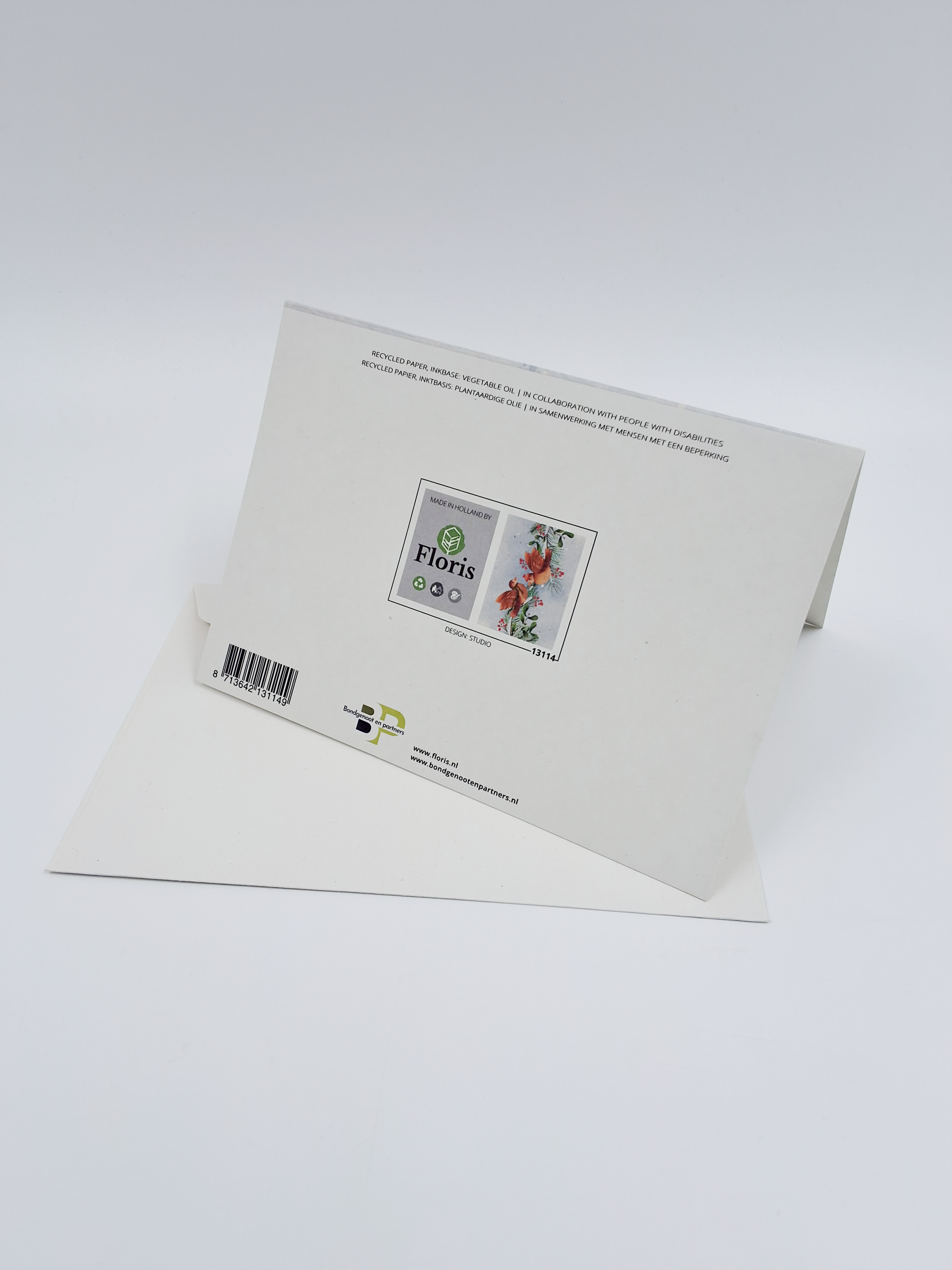 Onze kerstkaarten zijn gemaakt van gerecycled papier en bedrukt met inkt op basis van plantaardige olie.