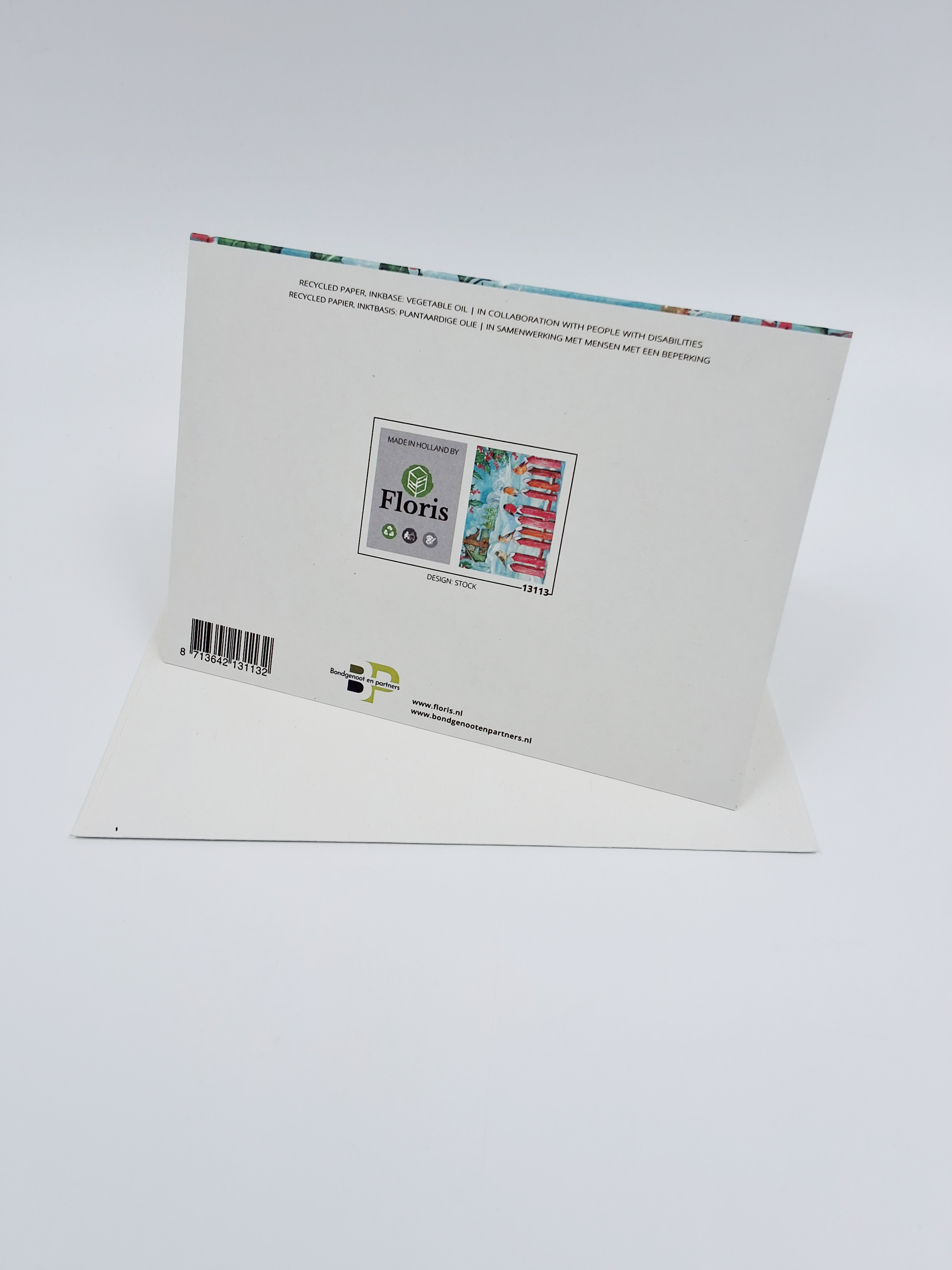 Onze kerstkaarten zijn gemaakt van gerecycled papier en bedrukt met inkt op basis van plantaardige olie.