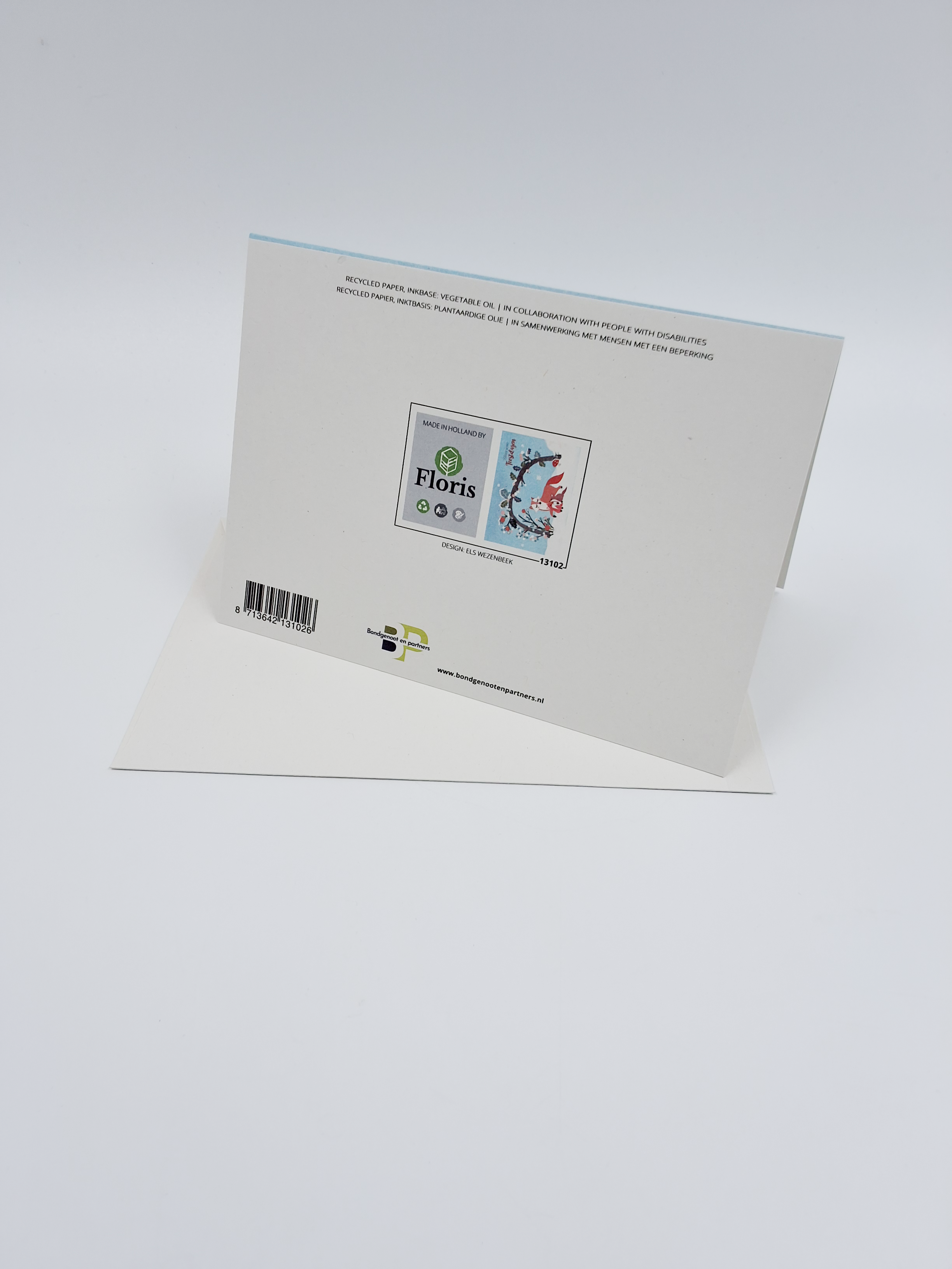 Onze kerstkaarten zijn gemaakt van gerecycled papier en bedrukt met inkt op basis van plantaardige olie.