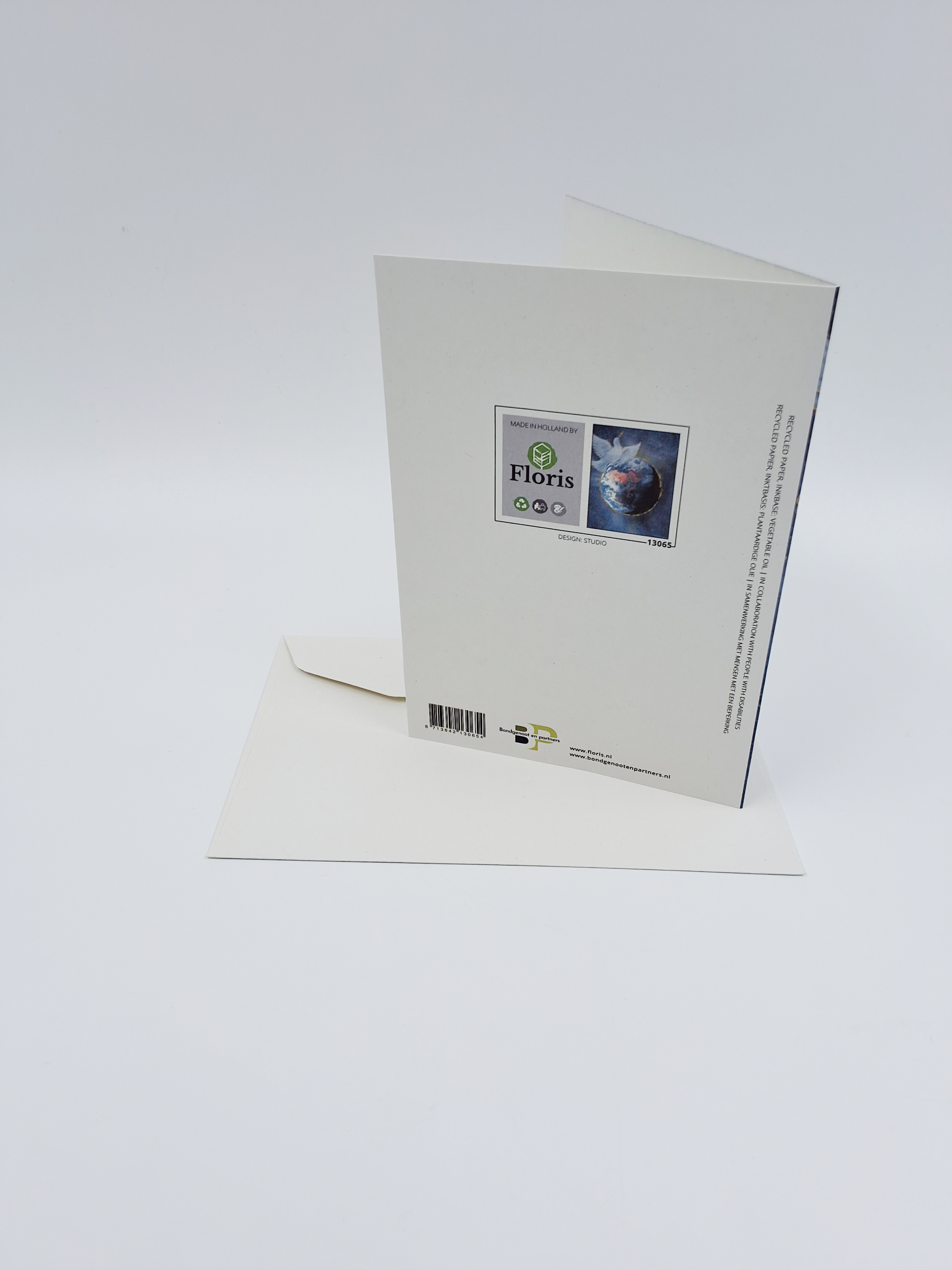 Onze kerstkaarten zijn gemaakt van gerecycled papier en bedrukt met inkt op basis van plantaardige olie.