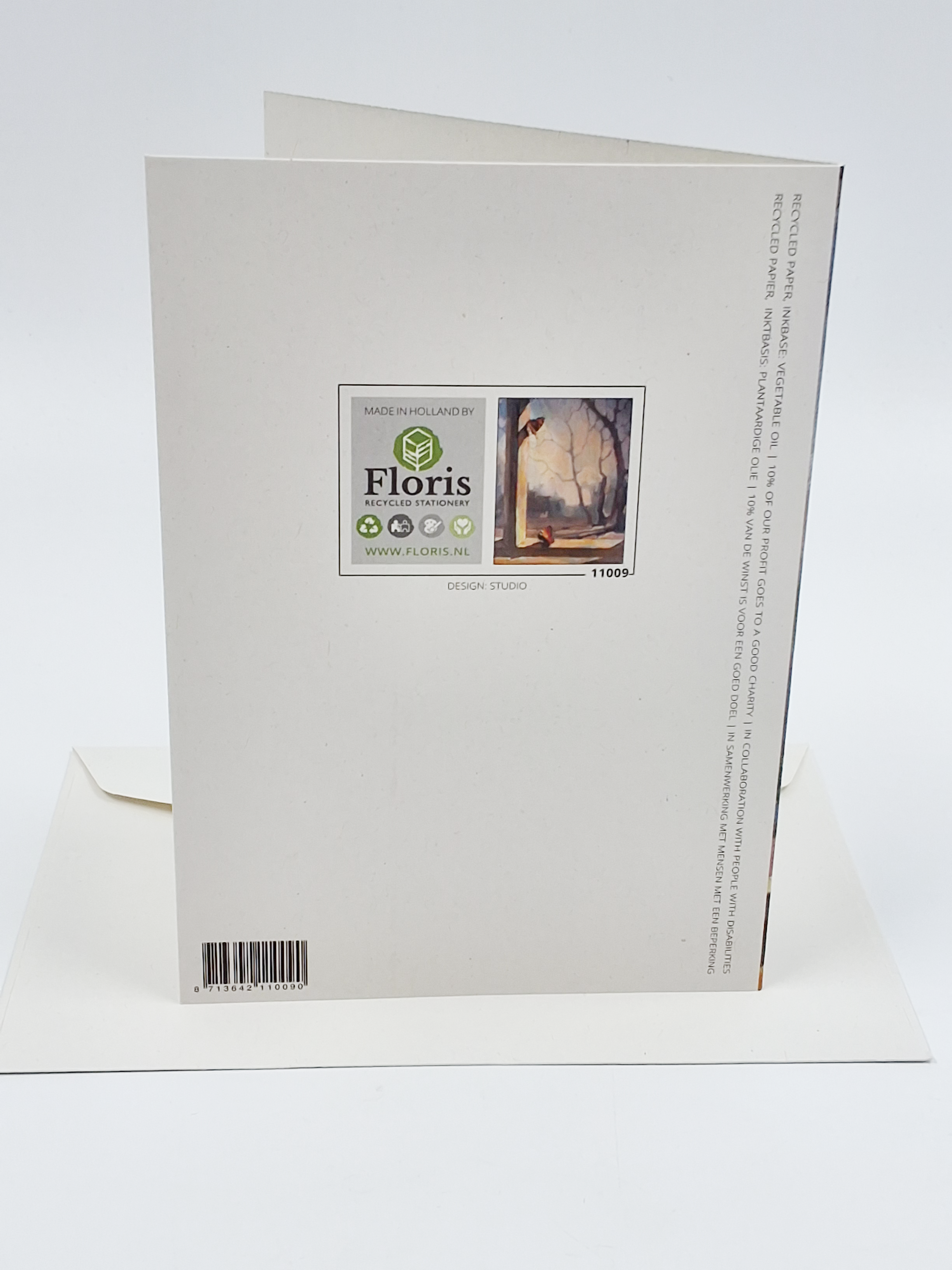 Onze wenskaarten zijn gemaakt van gerecycled papier en bedrukt met inkt op basis van plantaardige olie.