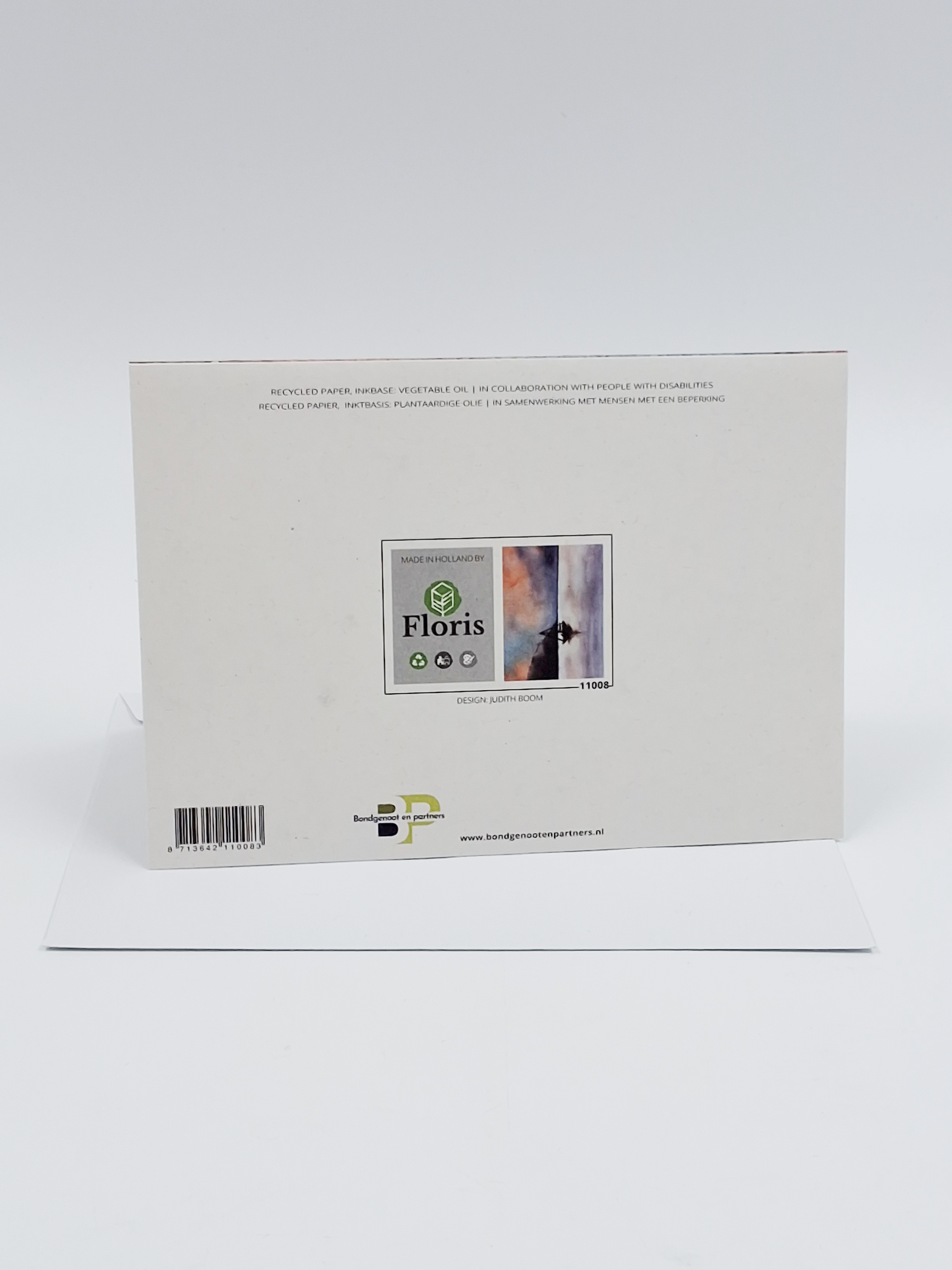 Onze wenskaarten zijn gemaakt van gerecycled papier en bedrukt met inkt op basis van plantaardige olie.