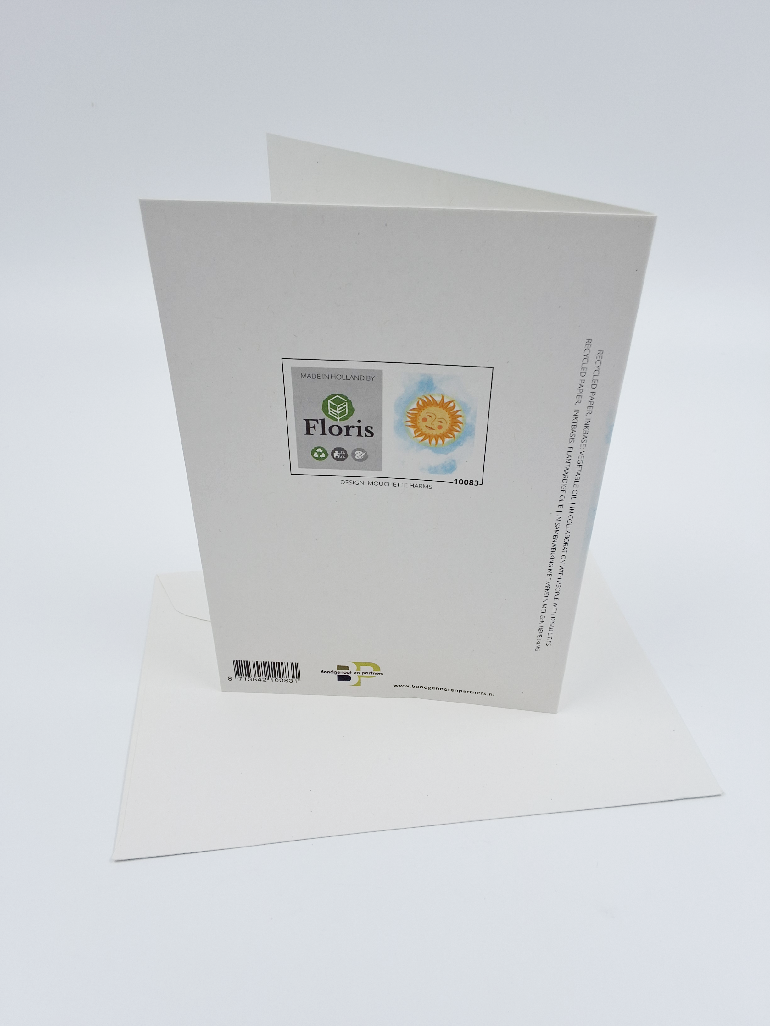 Onze wenskaarten zijn gemaakt van gerecycled papier en bedrukt met inkt op basis van plantaardige olie.