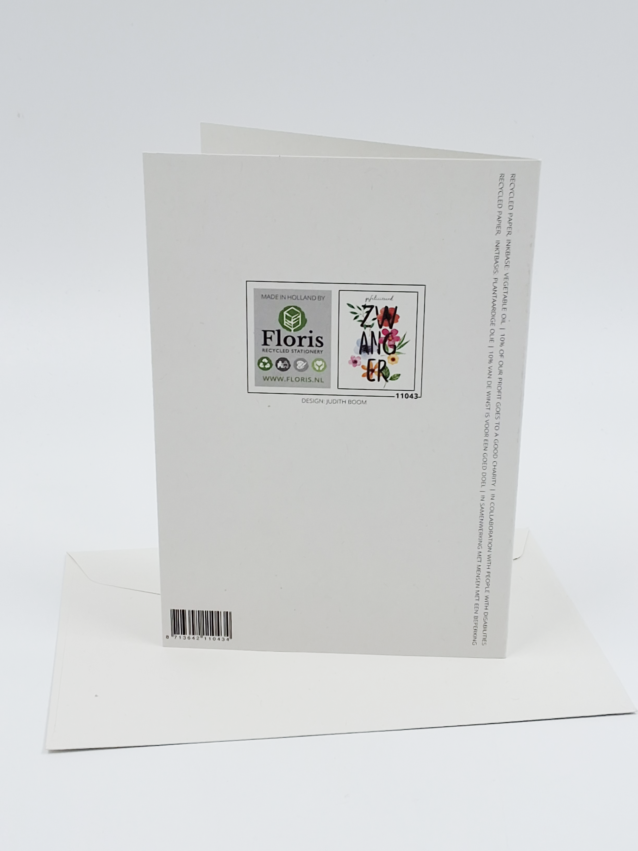 Onze wenskaarten zijn gemaakt van gerecycled papier en bedrukt met inkt op basis van plantaardige olie.